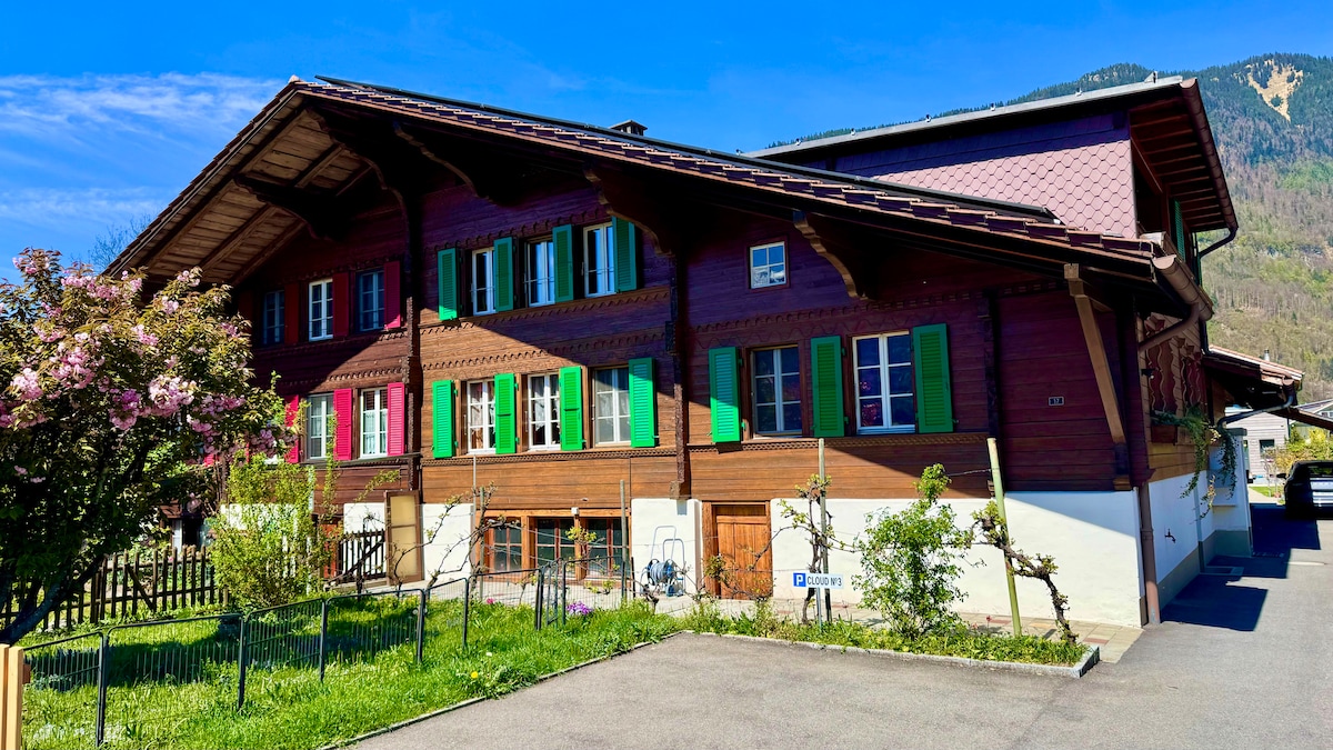 This historically listed Swiss Chalet, offers apartments with great views from the balconies, spacious sunny rooms, fully-equipped kitchen, Free wifi, living room, and is situated in the perfect location to explore the Interlaken area. Only 10min walk to the centre of town, great bus links and access to the stations, and to the surrounding areas. Grocery store 50m away, open 7 days a week and a great local bakery across the rd offering the regions delicacies.