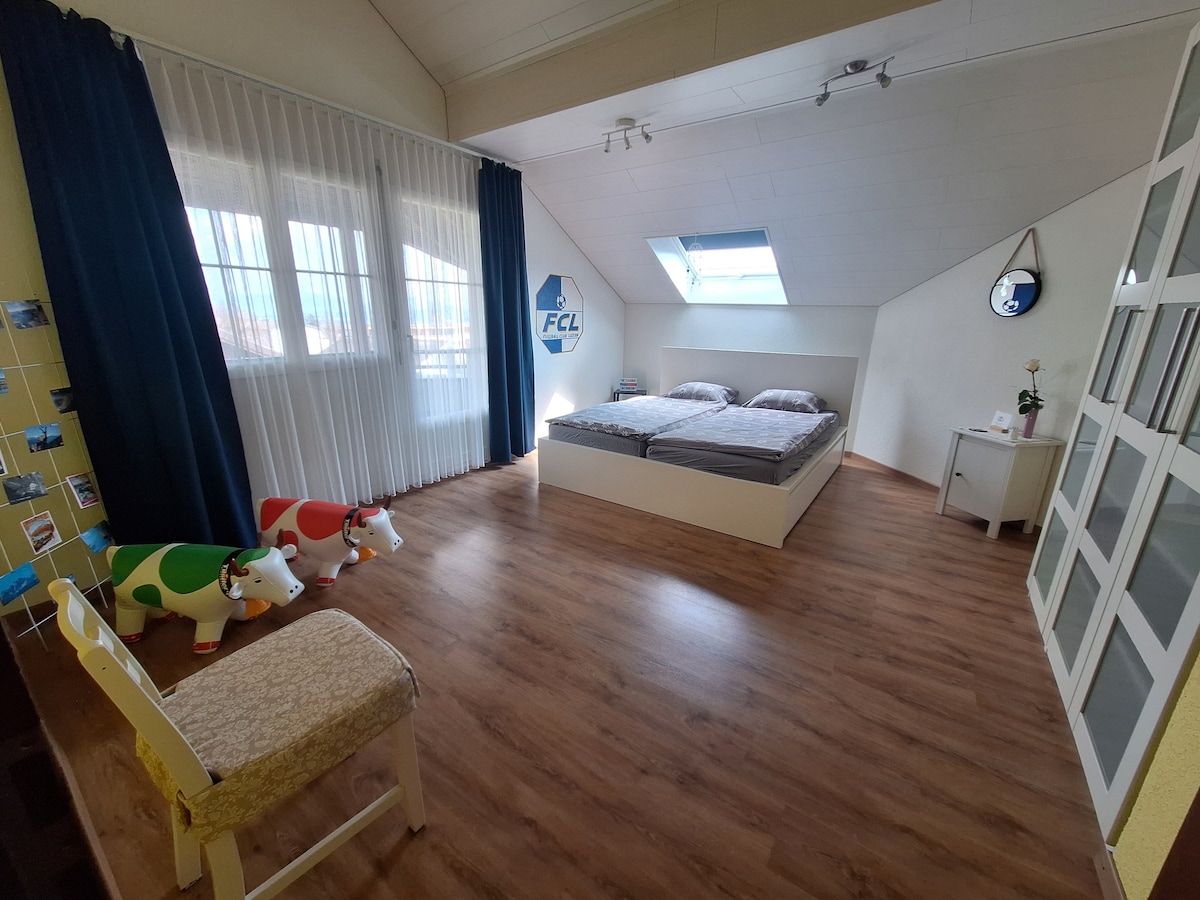 Close to the city and still in the countryside, two large rooms (1 livingroom, 1 bedroom) with balconies and wonderful mountain views await you. A newly converted guest toilet and guest bathroom with shower for sole use. Possibility for a 3rd person (mattress on the floor) in the room for an additional Fr. 50.-. NO kitchen available! Buffet with coffee machine, kettle and microwave. In a calm neighborhood. By public transport in the city of Lucerne in 30 minutes (bus 800m, train 1.3km).