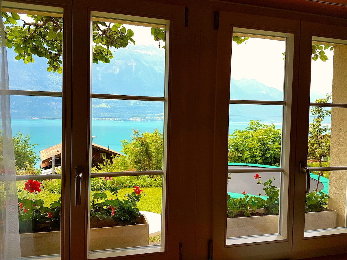 Unser Traditionelles Holz Chalet liegt am Südhang leicht erhöht über dem Brienzersee. Von der Ferienwohnung aus geniessen Sie einmalige, wunderschöne Aussicht über den grünblauen Brienzersee mit umliegenden Bergen! Die Wohnung liegt im Parterre und hat direkter Zugang zur Garten mit Terasse +See/Bergsicht Es sind 3Min zu Fuss zum Seeufer. GRATIS PARKPLATZ direkt neben dem Haus. Viele Sportliche-Ausflugsmöglichkeiten in der Nähe. Trampoline ist nur für unsere Gäste. *Sehr beliebt für Homeoffice*