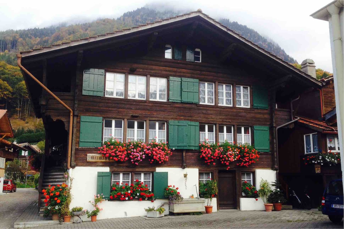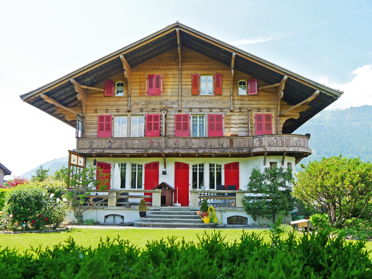 The Chalet Maria is a listed Swiss house which was built in the traditional style at the turn of the last century. The chalet is family owned in the third generation and is located in an exclusive location directly on the shipping canal and offers a beautiful view of the surrounding mountains. From the balcony you have a direct access to the well-known mountains Eiger, Mönch and Jungfrau.