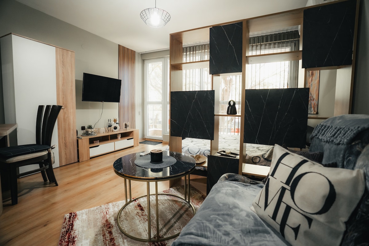 Welcome to my brand new and cosy place, designed with a lot of love,care and thought so you can haver a truly relaxing stay in Plovdiv. The building is just in front of the International Fair Exibition, just a short walk to the City Center across the beautiful Maritza River. The neighbourhood is really lively, communicative and safe. I will be happy to meet you and accomodate you personally, so you will immediatelly feel as an old friend who came to visit :)