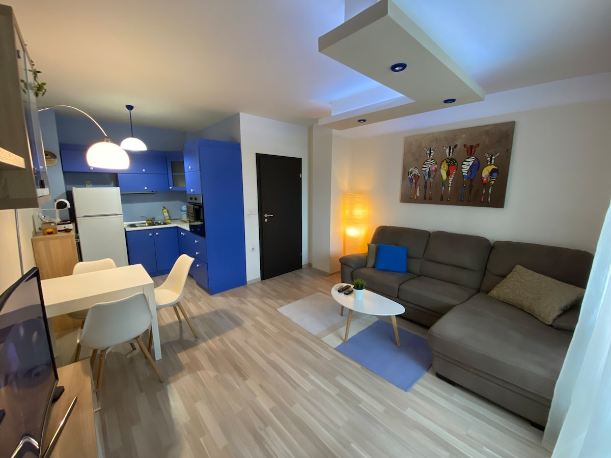 New contemporary apartment located only 10 minutes away from the center of the city and the Old town. The International Fair and The Grand Hotel Plovdiv are 5 minutes walking distance. Next to bus stops. Free parking on the street. The space consists of one bedroom with a comfortable king size bed, large living room with a flat screen TV and a huge sofa which turns into nice bed for two. There is air conditioning. The kitchen is equipped with everything necessary.