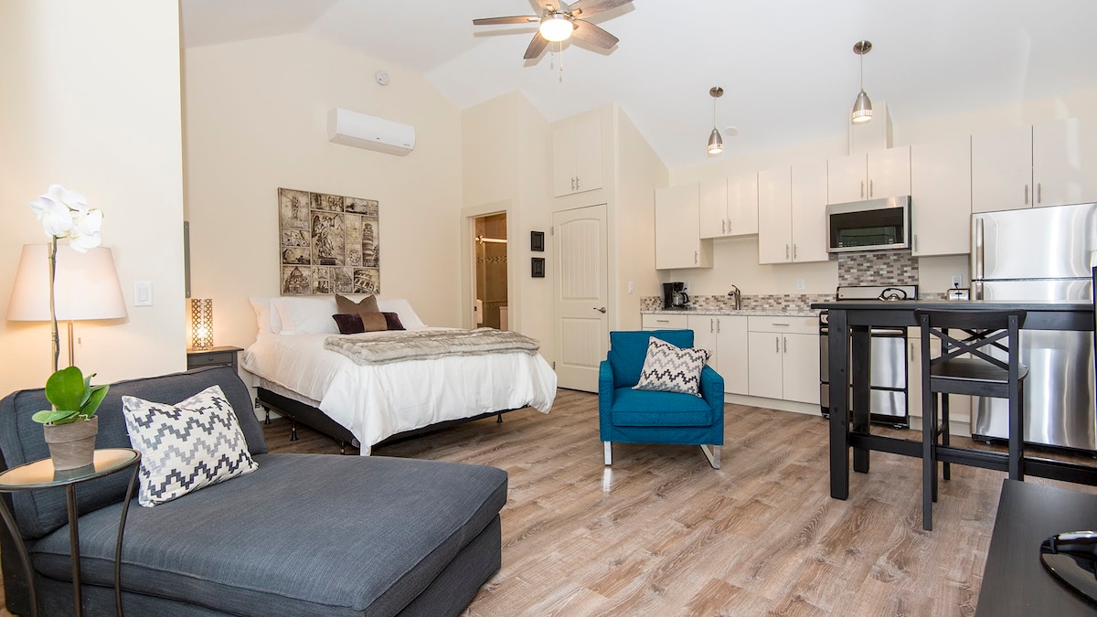 The space is a well appointed, comfortable studio apartment. It is an ADU at the back of the main house. All the amenities that one would desire are provided (wifi, internet, cable TV, washer & dryer, fridge, dishwasher, stove, microwave, AC, cooking utensils, etc., etc). It is also very modern and clean, with a private entrance and keyless entry. Close to many restaurants, bars and coffee shops.