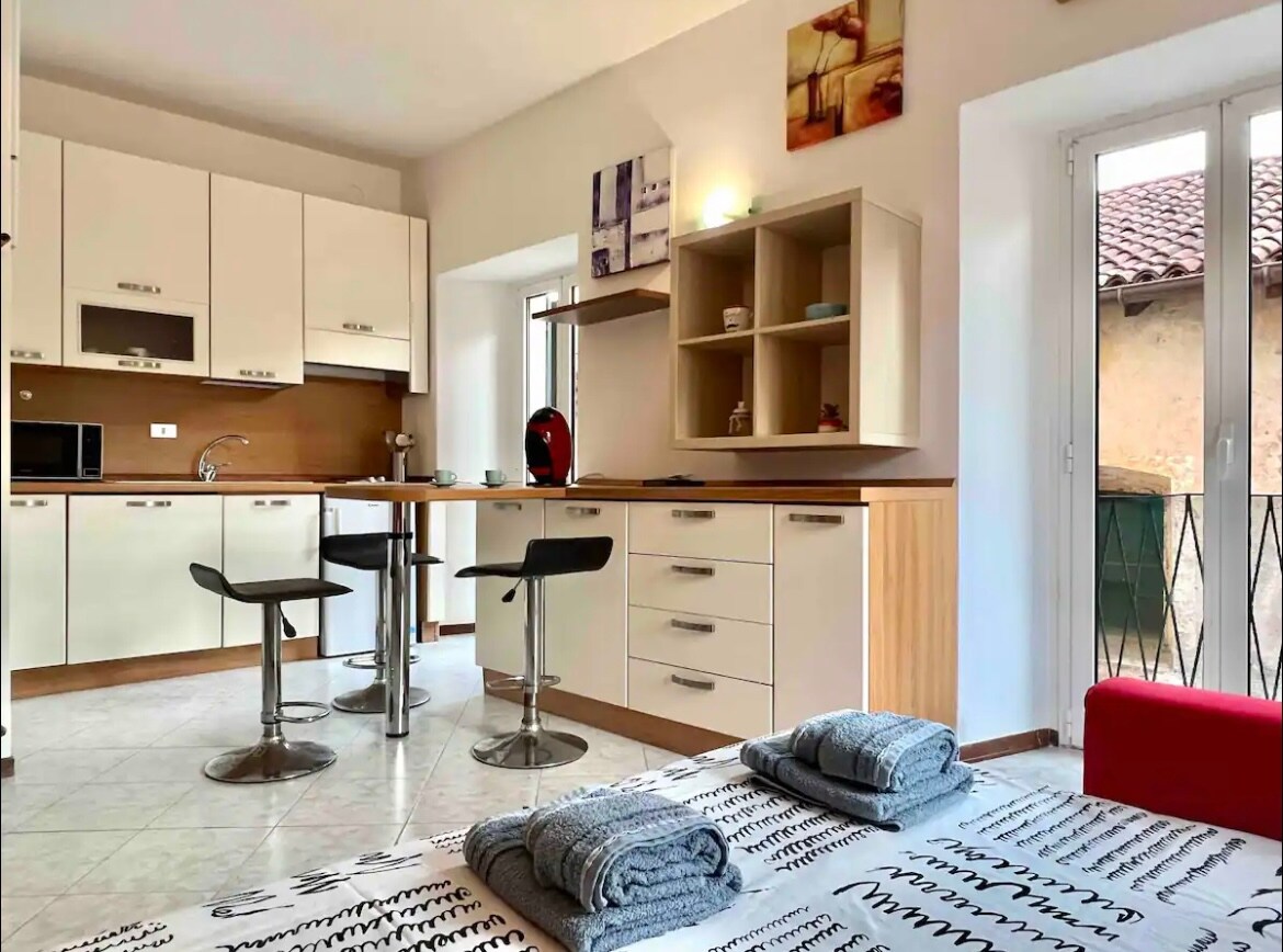 Elegante Appartamento, con terrazza. Arredato in maniera funzionale per viaggiatori da tutto il mondo, di nuovissima costruzione. L'appartamento è composto da una accogliente camera matrimoniale. La cucina, con penisola vista soggiorno, è dotata di ogni comfort (forno, frigo, set posate/pentole e macchina del Caffè Nespresso).Il tutto è corredato da una TV 4K Ultra HD, Smart TV (Netflix, YouTube ecc..) connessione Wi-FI e confortevole divano letto (140x200cm) A 1,2km dal Lago Maggiore.