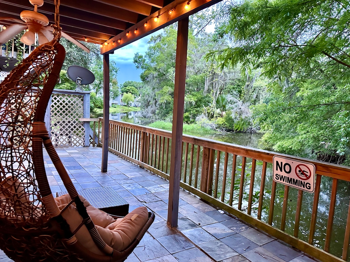 Enjoy your stay at this shady oak guesthouse. It is located on our 2 acres of land with the view of a neighboring lake. Don’t let the size fool you, it has a queen size bed, small kitchenette with fridge, microwave and coffee. The eating area can double as a workspace if needed. It has a full-size bathroom as well. It has a brand new ac and air purifier. It has outdoor seating, privacy fence and keyless entry. Minutes away from JIA, River City Marketplace, the Zoo and the Cruise terminal.