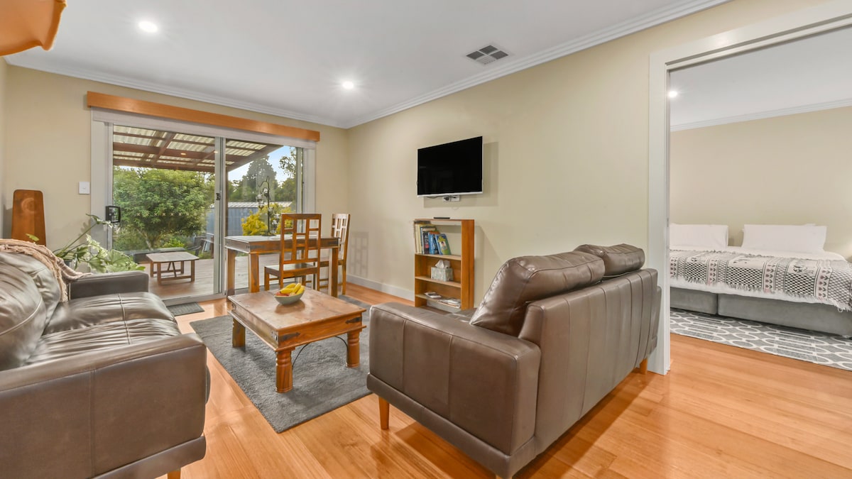 Our cosy and compact studio is a bright, sunny space suitable for either a couple or a single traveler. The studio's spacious undercover deck in a quiet, park-like setting extends and enhances the living space. It's a great place to sink into a comfy chair with a book or enjoy a delicious BBQ. A comprehensive shopping centre within easy walking distance means that you won't need to go far to stock up on all essential supplies and services. Anyone for golf?