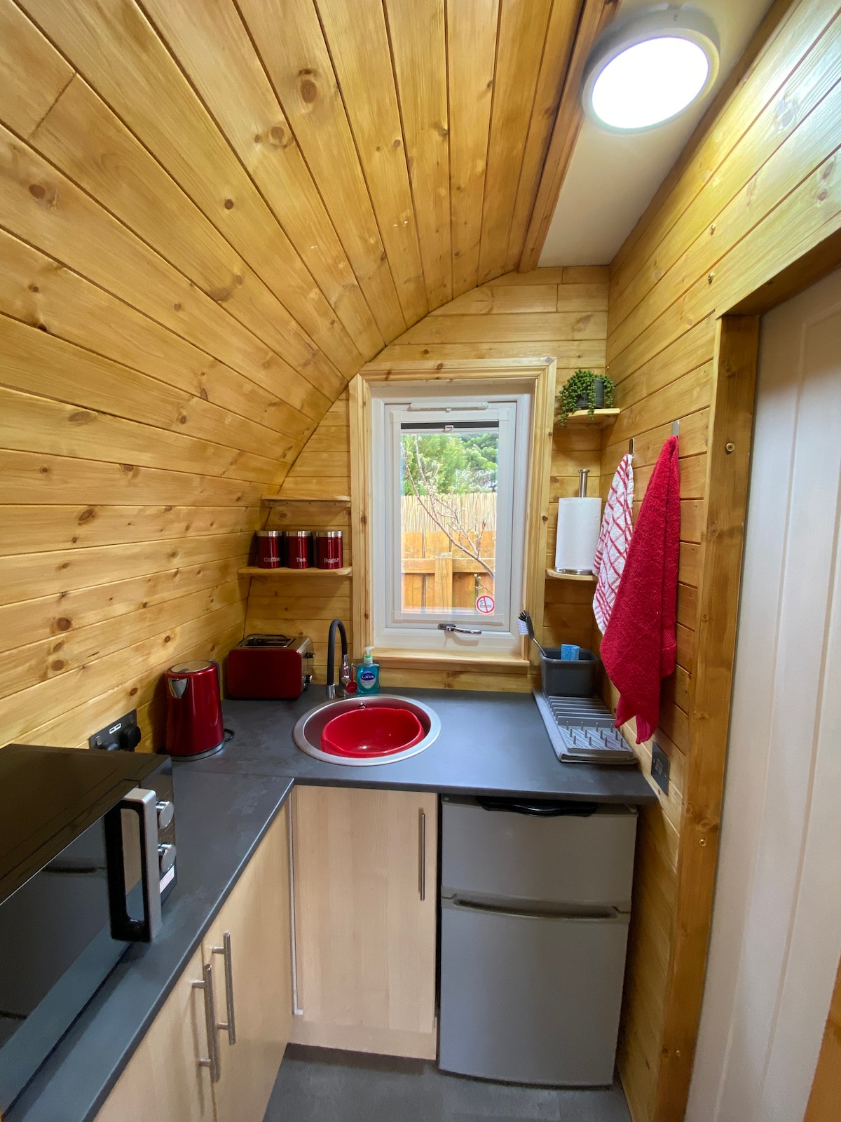 This bespoke, spacious, bright, luxury Glamping Pod is self contained and situated in a private, secluded part of our property. The private deck, along with outdoor furniture & chiminea, overlook beautiful fields & mountains. Located just 1 mile from the NC500 route. Our pod boasts a king size bed, shower room & furnished kitchen, which includes a fridge/freezer, microwave & slow cooker. Other amenities available on request. Complimentary tea/coffee making facilities.
