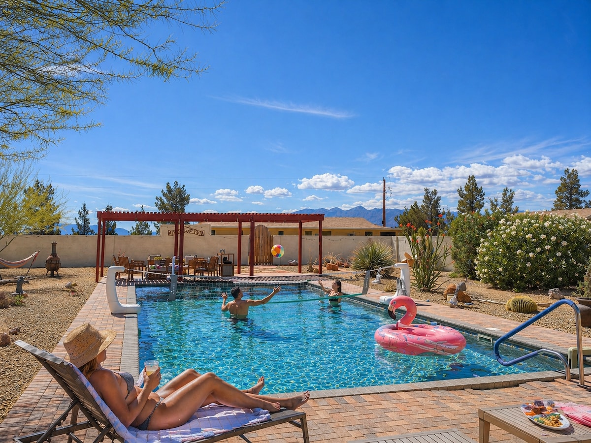 Nothing ordinary. Our home sits at the intersection of spacious & cozy, quirky & practical, spiritual & hedonistic. Imagine laughing by the fire, BBQing, playing cornhole, sunset toasting on swings with a Mt. Charleston backdrop & stargazing/ moongazing. An array of culinary gadgets, spices, & outdoor appliances will inspire your inner chef. Upgrade your experience to enjoy the HEATED pool. Or let it be your base to explore Death Valley! Once a lake, now a Desert Oasis. Create your story!