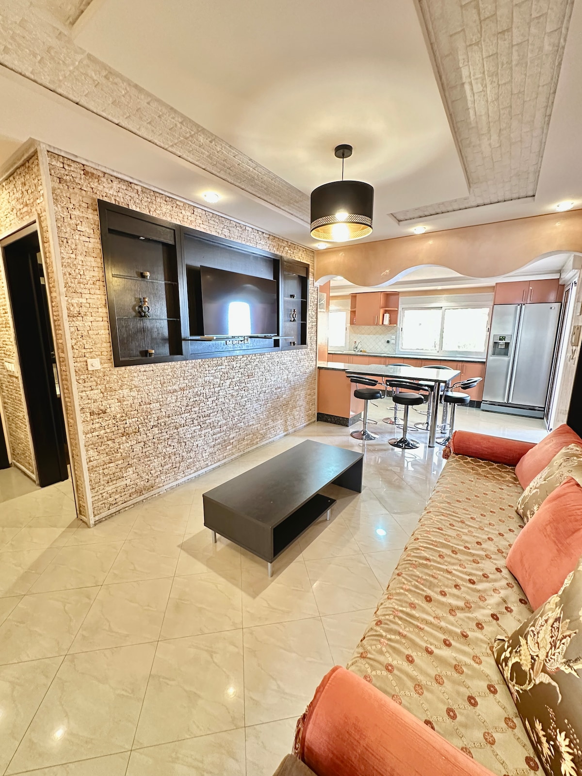 Sunny 1st-floor apartment in central Agadir, steps from cafés, shops, and a 10-minute walk to the beach. Enjoy a cozy living area with a 65'' TV, fast WiFi, and a full kitchen. We can arrange airport transport, surf/skate lessons, quad & jet-ski rentals..., and trips to Paradise Valley, the Agadir desert, or other places. ⚠️ Only registered guests allowed, no visitors