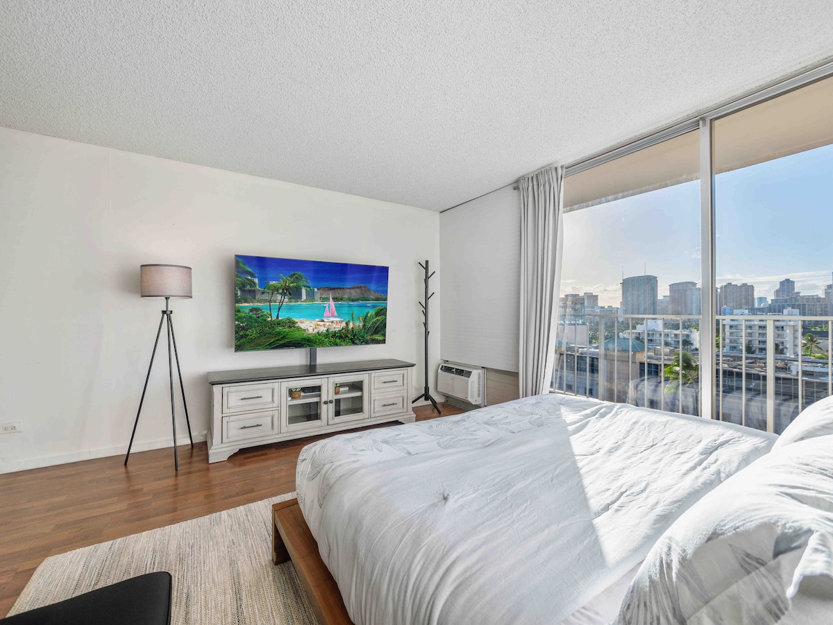 This spacious unit of ~790 sqft is of the same building of Aston Hotel at downtown Honolulu. So, treat yourself and your family with hotel facilities with warm aloha from personal touch and at the same time at a price that is reasonable. The unit is located at higher floor and you are guaranteed a breathtaking view of downtown Honolulu and the sea from your bed room.