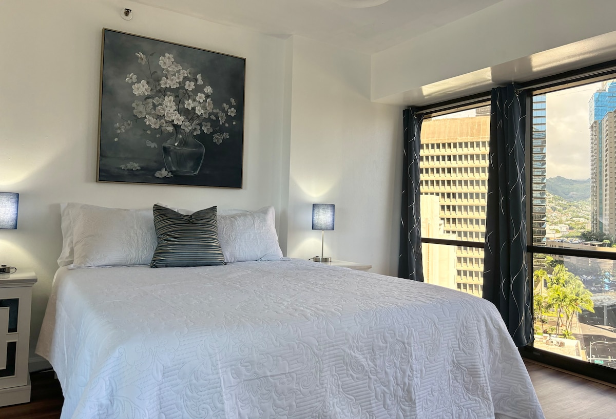 Spacious 1 BR/1 BA apartment, approx. 616 sf. Conveniently located in the business district of downtown Honolulu. Walk to shops, convenient stores, gym, & bus lines. About 3.5 miles (25 min-30 min drive) to Waikiki. Full kitchen with stainless steel appliances. A queen size bed & a 20" thick queen size self inflating air bed. Jacuzzi tub, washer/dryer, a desk for work space. Whether by bus or in a rental car, if you're plan is to explore the island, this is the perfect location!