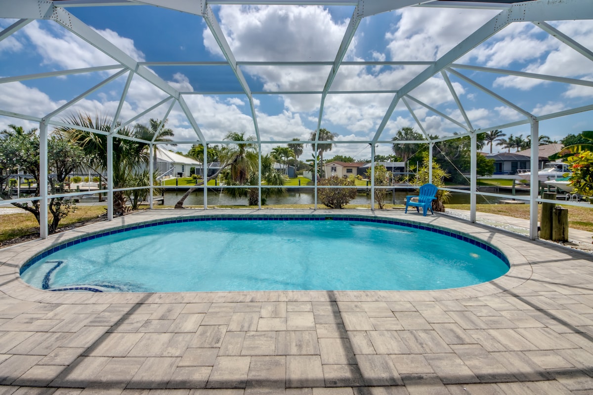 ONE OF THE BEST WATERFRONTS IN CAPE CORAL! A short walk to the beach a. This 2,500+sq ft home has stunning sunsets and South Western water views from all main living areas,as well as the Master Suite. Heated pool w/ LED colored lighting, built in Spa,Pool bath, full laundry facility, Lanai,Fireplace ,Wi-fi and TVs in every bedroom, private dock . Boat on lift for rent w/RPM rentals . Large 2-car garage w/5 bicycles,beach wagon & cooler on site.