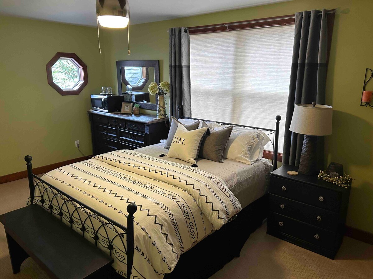 Welcome to our lake home! Guests have the second floor living to themselves - bedroom with queen bed, sitting/tv area (with a queen sleeper sofa, two recliners, and a small dining table with lake views) and full bath. Coffee maker (tea and coffee provided), refrigerator, and microwave included in your private space. Beautiful all sports lake with use of kayaks. Great fishing lake as well. Come relax and enjoy the peaceful living!