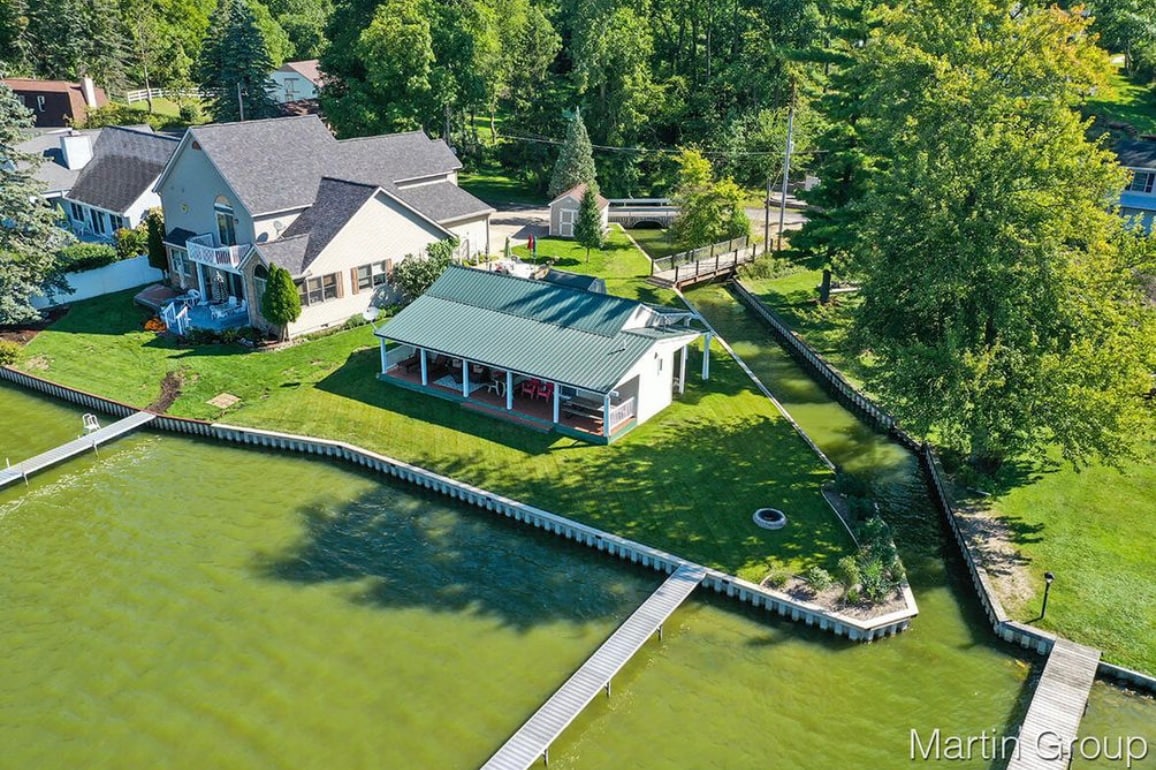 Relax - Play - Swim - Fish - Boat - Hunt Enjoy LAKE LIFE with this spacious yet cozy retreat. Renovated main house with 3 bedrooms/2 full baths. Bunk house with 2nd kitchen + full bath sleeps 8. Pole barn with many activities, huge backyard. 20 ft frontage with dock on 356 acre, all-sport, Long Lake. Enjoy the view from the deck overlooking the lake or walk down the stairs for direct beach access. Pontoon rental available. Property adjacent to the 11,000+ acre Flat River State Game Area.