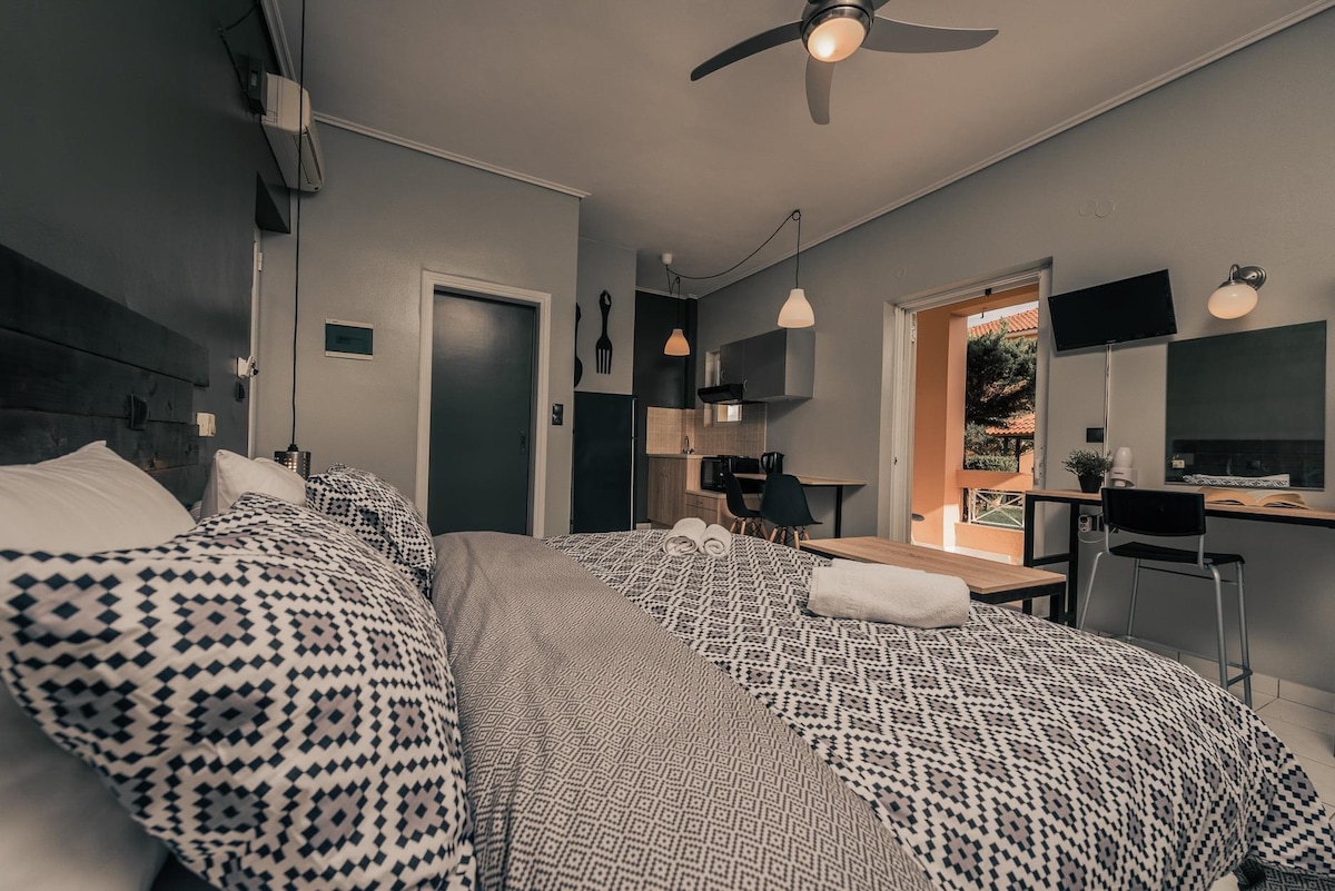 All apartments have spacious feeling and plenty of light, large bathroom, well-equipped kitchen, comfortable double beds with anatomic mattress. All apartments' rooms are fully air-conditioned, and roof ventilators in bedrooms. The design combines natural materials, light colors with a "Greek touch". The backyard is for all of our guests. Huge free parking area is 150m away. Enjoy wondering in the beautiful little alleys, taste local delicacies and more. Welcome to feel home at Eriel!