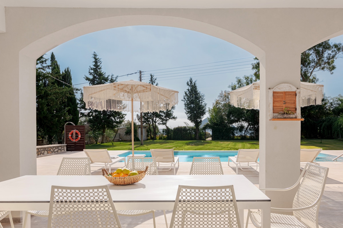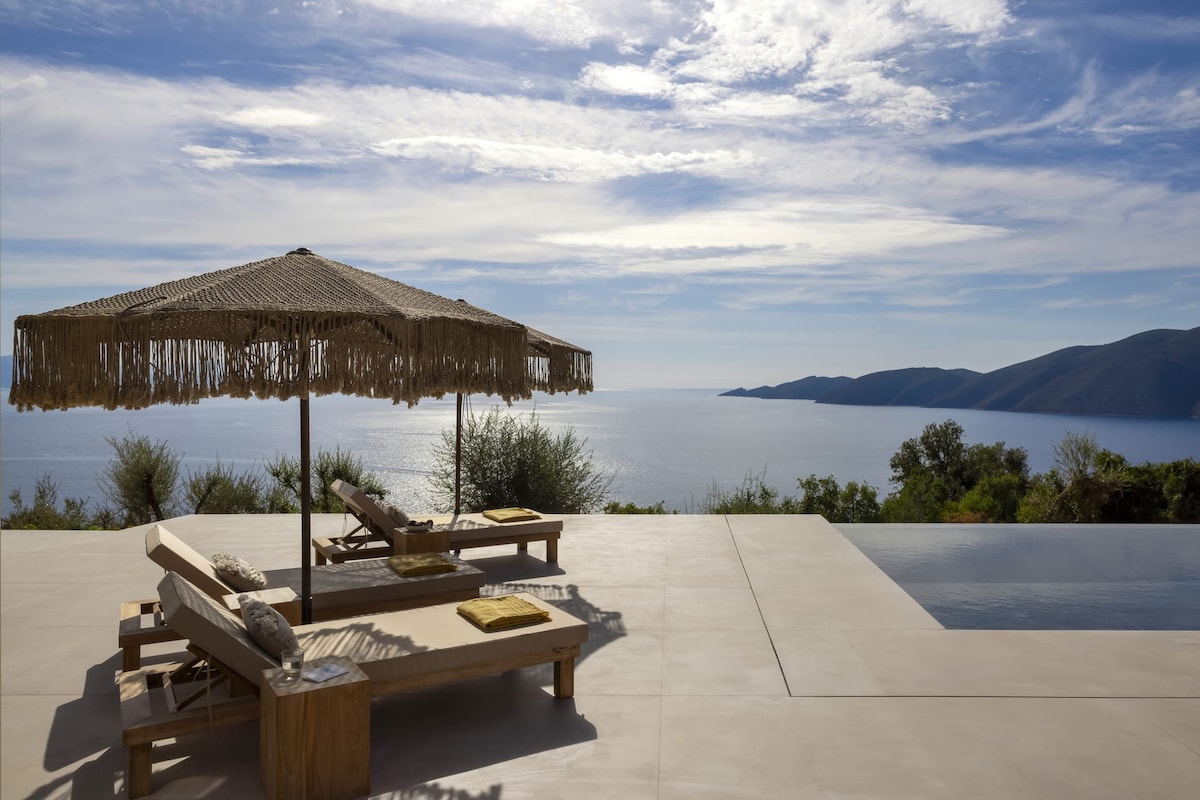 Savour the easy pleasure of island life at this serene Greek estate. Its surrounding landscape is rich with dense shrubbery and cypress trees that provide a natural shield of privacy. After dark, strategically placed lights illuminate the rugged stone façade, glass accents, and terracotta roof. The Ionian Sea is just beyond the backyard—why not charter a private yacht to cruise the coast in style? Two separate, equally stunning villas makeup Viva La Diva and both feature spectacular views of the Mediterranean-inspired garden. A dichotomy is created between old and new, offering a charming aesthetic to the interior. Rocky arched doorways lead from one room to another while faded hardwood floors flow throughout. An airy ambiance inside is achieved by towering vaulted ceilings and broad glass doors that disappear into the walls, opening up the living area and expanding the space onto the sun-drenched terrace. As you sip your morning coffee, perhaps catch a gull flying overhead or listen to the calming wind rustling through fragrant olive groves nearby. The heated infinity pool provides just the right amount of refreshing invigoration after basking in the midday heat. Sink into a plump lounger with a chilled glass of champagne, poured at the beach bar, as you watch the horizon transform into dusk. Either opt to feast on charcoal-grilled souvlaki in the solarium-style dining room or take your meal alfresco to enjoy an enveloping salt-infused breeze and a romantic, candlelit experience. Beneath the covered patio, a vintage Brunswick billiards table encourages friendly competition. Copyright © Luxury Retreats. All rights reserved. BEDROOM & BATHROOM • Bedroom 1 - Primary: King size bed, Ensuite bathroom with stand-alone shower, Walk-in closet, Television, Safe, Terrace • Bedroom 2: King size bed, Ensuite bathroom with stand-alone shower, Television, Terrace, Ocean view • Bedroom 3: King size bed, Ensuite bathroom with stand-alone shower, Television, Safe, Ceiling fan, Terrace • Bedroom 4: King size bed, Ensuite bathroom with stand-alone shower, Television, Terrace • Bedroom 5: King size bed, Ensuite bathroom with stand-alone shower, Television, Balcony • Bedroom 6: King size bed, Shared access to hallway bathroom, Bathtub, Television, Safe, Balcony • Bedroom 7: King size bed, Shared access to hallway bathroom, Stand-alone shower, Television, Terrace STAFF & SERVICES Extra Cost (advance notice may be required): • Activities and excursions • Linen change - twice per week • Gardener • More under “Add-on services” below