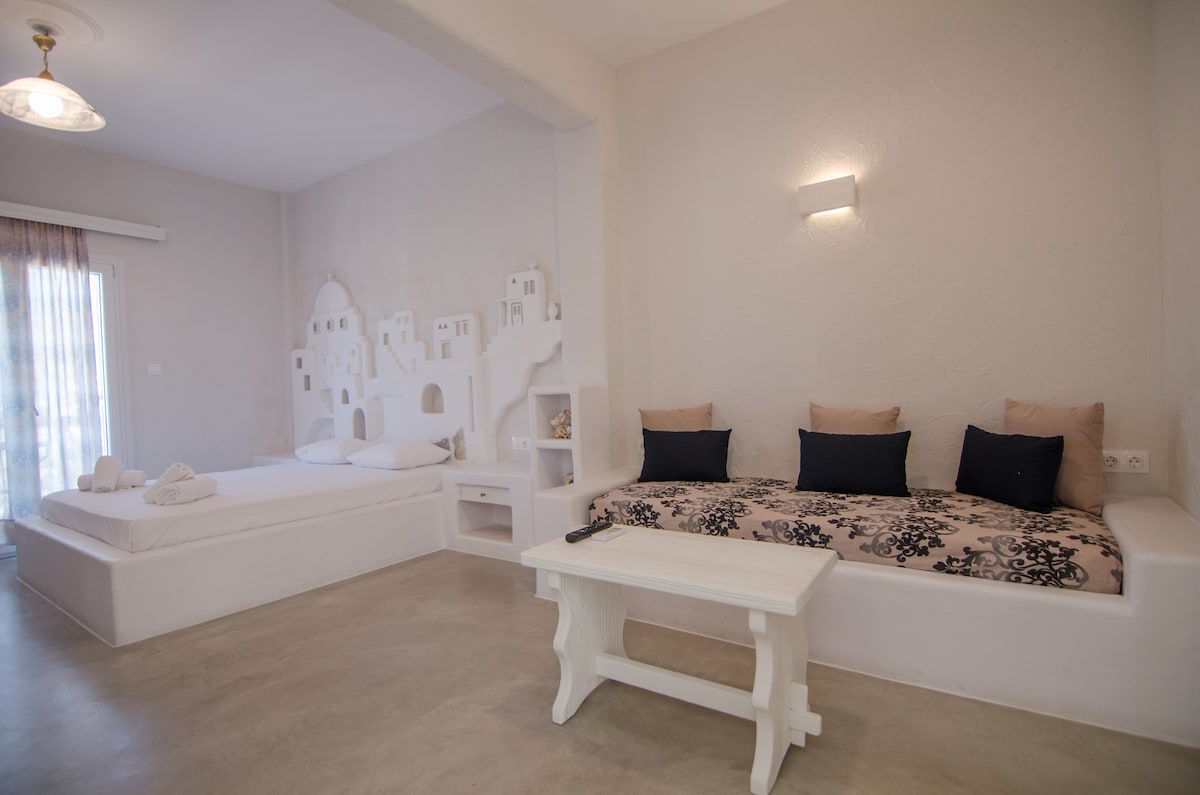 Fabulous room with enormous bathroom. Ideal for families or two couples. Made with original cycladic materials and style.