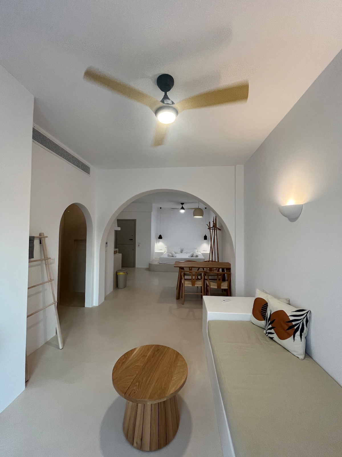 Fully equipped 40sqm self catering suites with the use of the infinity pool, set in an intimate, rural complex with beautiful landscaped and maintained gardens. Luxury Italian furnishings, flat screen TV with Netflix,very fast Wi-Fi. Own terrace and deck with breathtaking 270 degree views over the Aegean sea, surrounding islands and sunset. Suited for couples & families looking for a quality, safe and peaceful environment yet very close to the main town of Chora. Not suited for party people!!