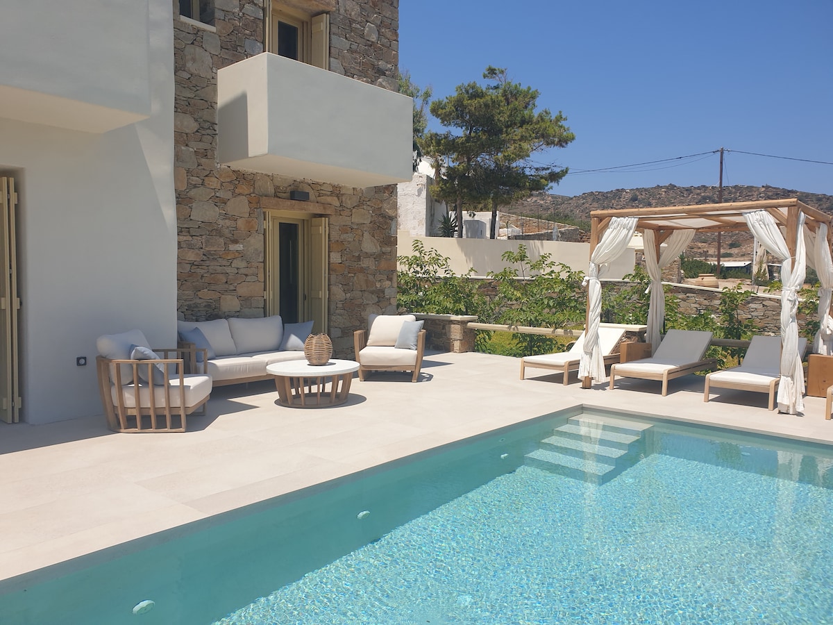 Sea and sun is a brand new house built on the side of the mountain. Only one kilometer away from the most famous beach on the island Mylopotas beach(car or motor bike required- dirt road). With two bedrooms, two bathrooms,kitchen, a living room and an outdoor pool. The sea and the sun are scattered throughout all the rooms of the house. Enjoy the magnificent sunset, the serenity of the sea and discover the beauty at the narrow streets of Ios! We offer special prices for two people!