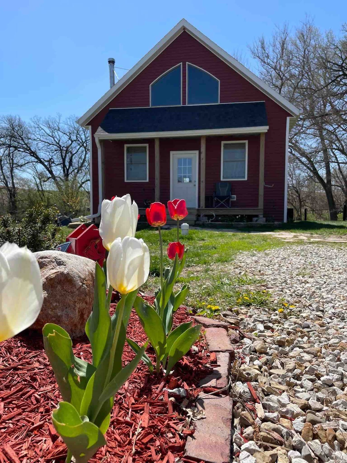 The Prayer Cabin is located at Lake Red Rock outside of Pella, IA. The cabin Is an Earthen/Berm home located on a 1 acre lot in a quiet & clean neighborhood. The lot boasts a wooded valley with many birds and squirrels to watch. The Prayer Cabin was recently remodeled with a brand new kitchen and bathroom. Our first guests asked us if Chip and Joanna were the creators of the design. 💚 Navy Blue cabinets, Tons of white shiplap and open shelving. Peaceful. A place of respite and relaxation.
