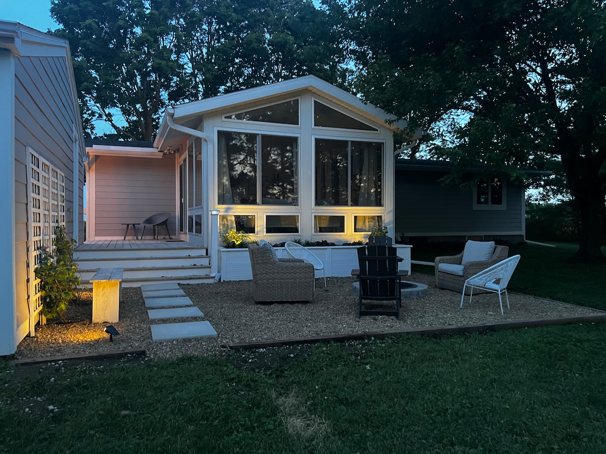 The perfect location for your getaway! Cozy and private yet just minutes from downtown Waverly and Wartburg College! The open concept layout includes a full kitchen, 70" tv + electric fireplace. The bathroom includes a 74x60 shower, a heated bidet + floors, double sinks, and a separate makeup vanity. The sunroom off the back faces an entirely private backyard complete with a fire pit & seating area. Laundry access! 1 queen and 2 single beds. Sleeps 4 but happy to accommodate extra guests!