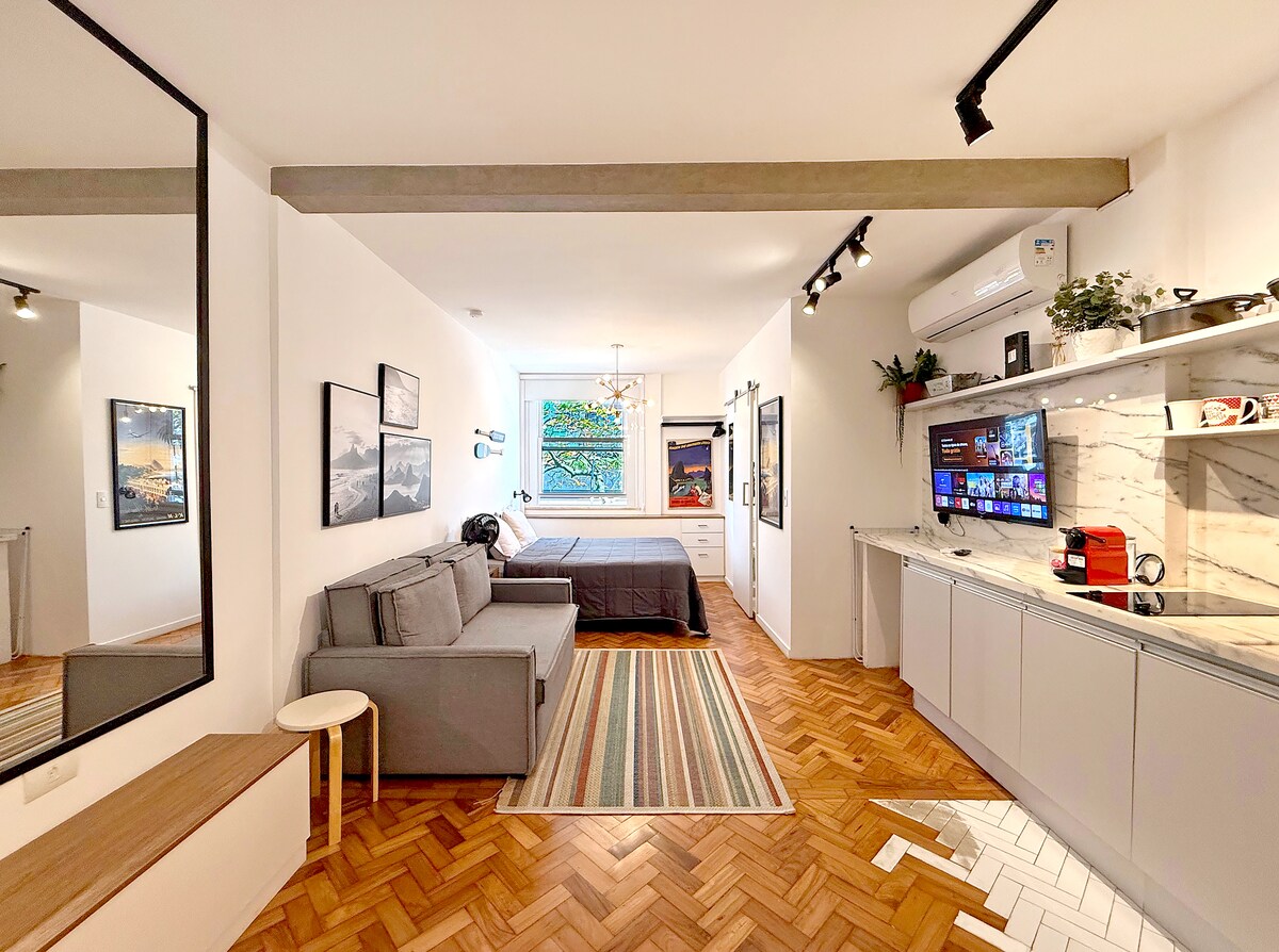The apartment was fully renovated, it's located in the best neighborhood in Rio, just one block from the beach, one block from mall, nearby teather, restaurants, subway station, bike station In a very cool building from the 60's, witch the faced is historically patrimony, in the inside, the floor plan was completely changed in order to offer, open and integrated spaces, lots of natural light. With good quality furniture, new appliances, quality cotton sheets and towels. 100% LGBTTQIA+ friendly
