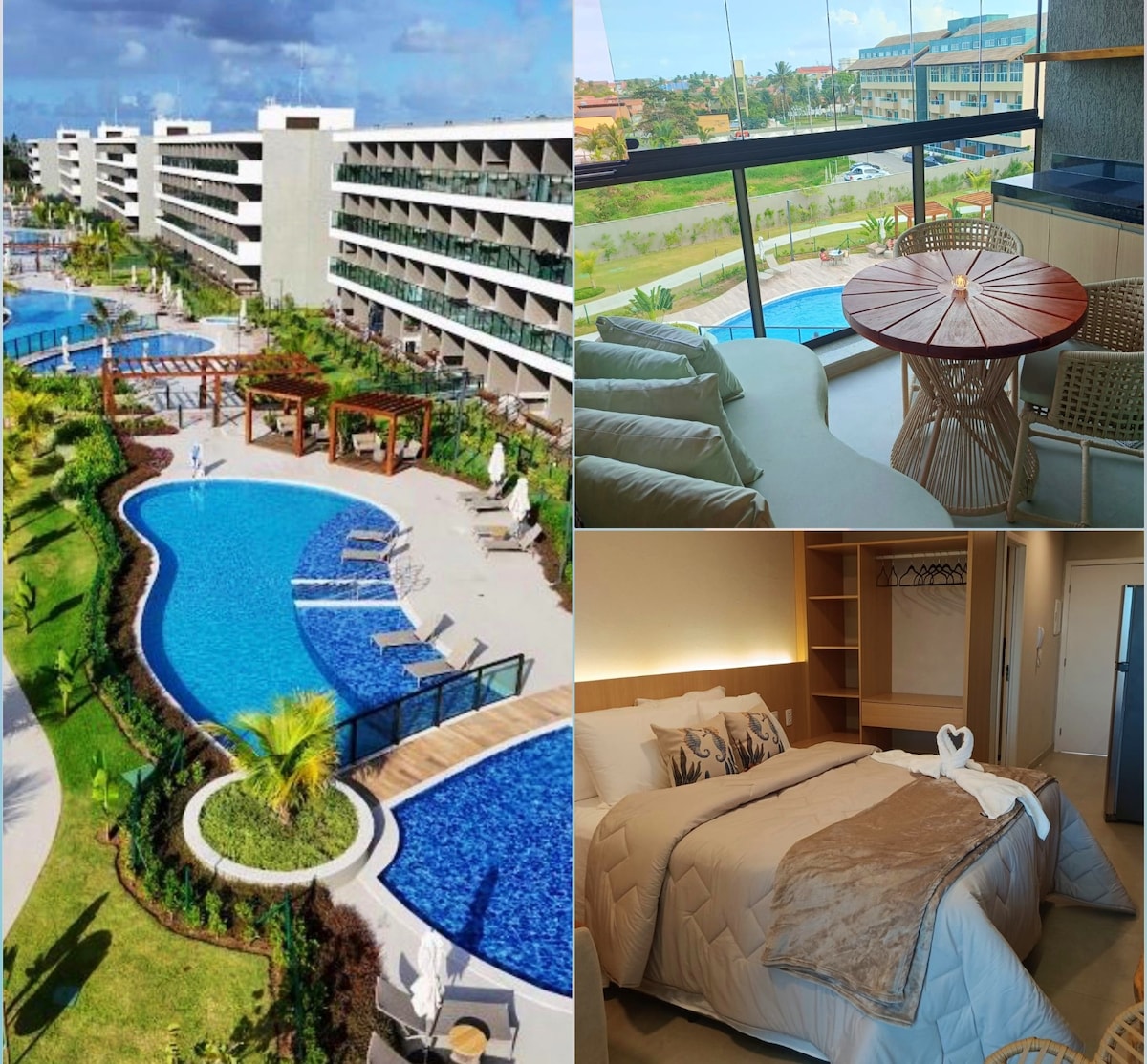 Hospedagem com muito LUXO e sofisticação? encontrou nosso incrível flat, montado com itens de alto padrão para proporcionar o máximo de conforto aos nossos hóspedes. Com 1 Cama Queen com extremo conforto, 1 cama auxiliar de qualidade e um excelente sofá cama, acomodamos bem até 4 hóspedes. O Flat possui uma decoração sofisticada que proporciona um ambiente relaxante após um dia de passeios em Porto de Galinhas e Muro Alto. A Cereja do Bolo é nossa varanda gourmet com uma ótima mesa, confortável e moderna para refeições e vista para o complexo aquático do empreendimento. A cozinha completa é equipada com os principais eletrodomésticos, como geladeira duplex, microondas, cooktop, cafeteira, liquidificador, sanduicheira e airfryer, além de todos os utensílios necessários para que você possa preparar suas refeições de maneira prática e confortável. O espaço foi projetado para que você tenha tudo o que precisa ao seu alcance, garantindo uma estadia sem defeitos. O apartamento está localizado em um condomínio que oferece uma estrutura completa de lazer com várias piscinas, playground, campo, academia, brinquedoteca, carregamento para carro elétrico, lavanderia, etc.. Temos Ferro de passar e secador de cabelos para maior comodidade dos nossos hóspedes. Se você busca uma acomodação premium, com bastante conforto e espaço, acabou de encontrar o que procura.