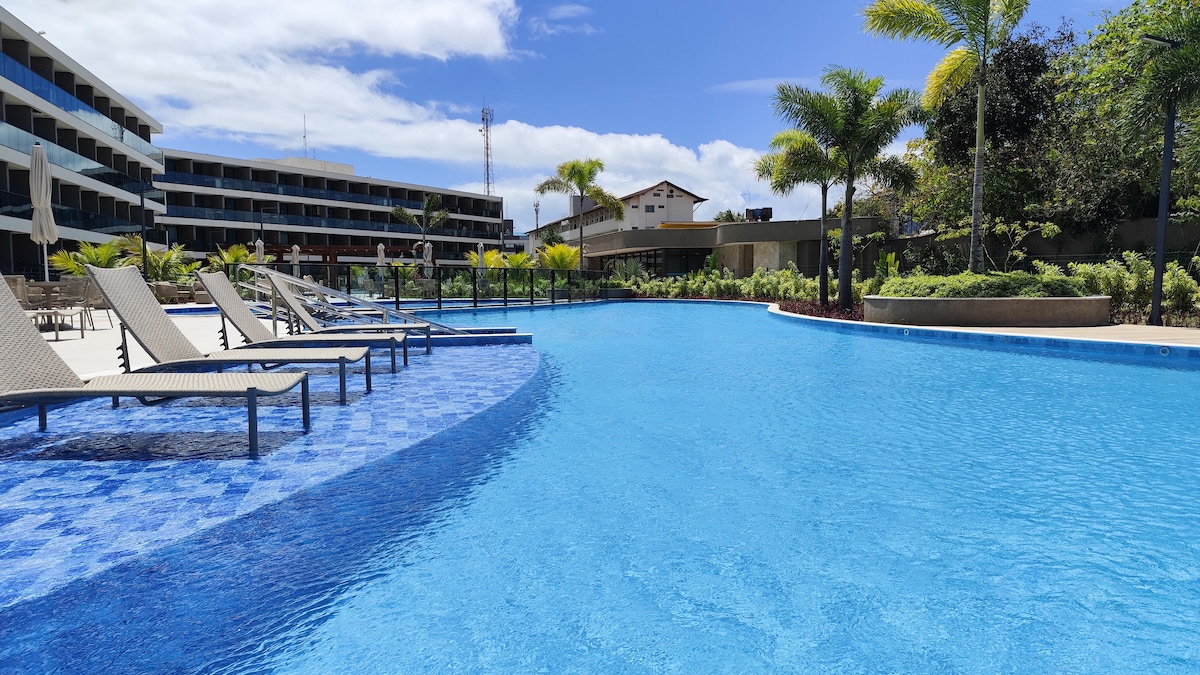 Olá! Nosso Flat fica localizado no Beach Class Muro Alto Resort que fica à beira mar e conta uma das maiores piscinas das Americas com 3.200 mt2, 02 restaurantes, SPA, loja de conveniência, lavanderia e etc. O Flat possui 02 quartos e acomodam confortavelmente 06 pessoas, 02 camas de casal além de 01 sofá cama (casal), todos ambientes dispõem de Ar condicionado e TVs 4K com streaming gratuitos, varanda, cozinha equipada e mesa para refeições. Praia de Muro Alto é uma das mais belas do Brasil.