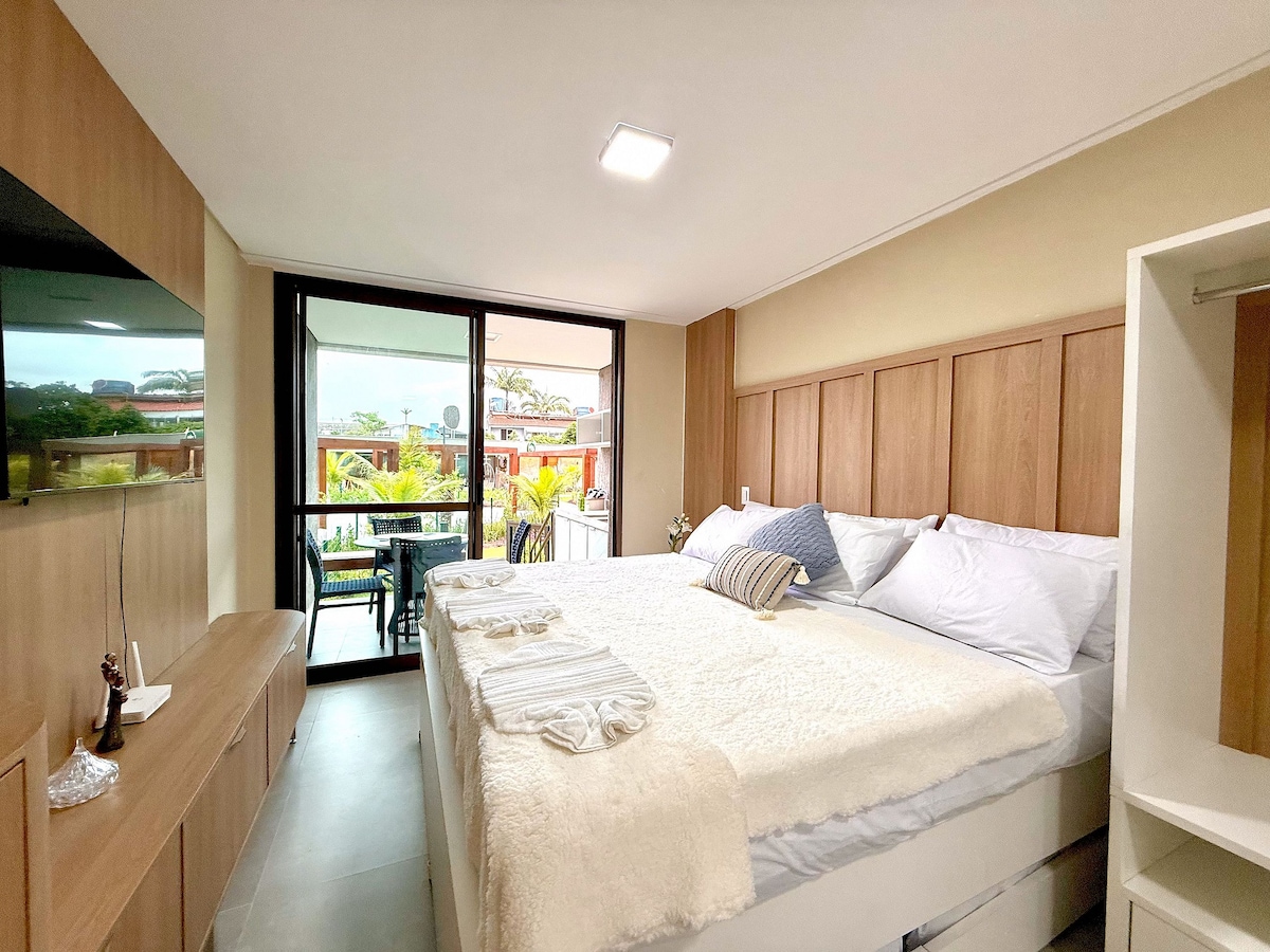 Desfrute de férias inesquecíveis em Porto de Galinhas neste flat com uma VISTA MAR DESLUMBRANTE. Apartamento 1 QT Alto Padrão Luxo em Condomínio Beira Mar, com: -deck frente praia - estrutura beira mar c/ cadeira e guarda sol - rooftop com piscina e área gourmet /churrasqueira -vista de 360 graus de Porto de Galinhas. A uma curta caminhada do centrinho das piscinas naturais de Porto de Galinhas (900m). -Ar Cond. SALA e QUARTO -Cozinha Equipada -WIFI -Estacionamento -Enxoval Completo
