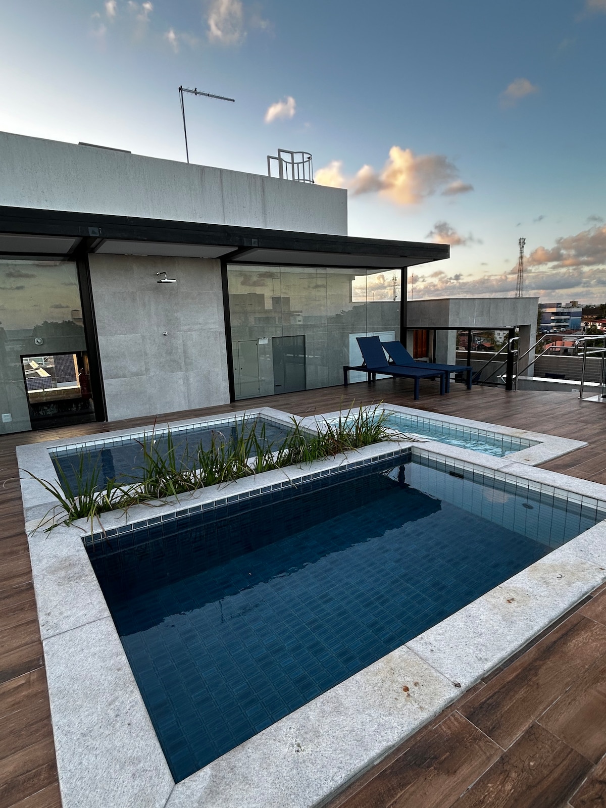 No réveillon o nosso condomínio é ponto do transfer do Amoré. Aproveite o charme e tranquilidade de um flat térreo novíssimo com deck e piscina (não aquecida) privativos, localizado a apenas 150 metros da praia. O flat foi decorado e equipado para que você tenha tudo que precisa em todos os momentos, seja no descanso ou na curtição. Aproveite também o rooftop (área comum) com vista para o mar, que conta com uma bela piscina, churrasqueira, mesas, cadeiras, espreguiçadeiras e sauna.