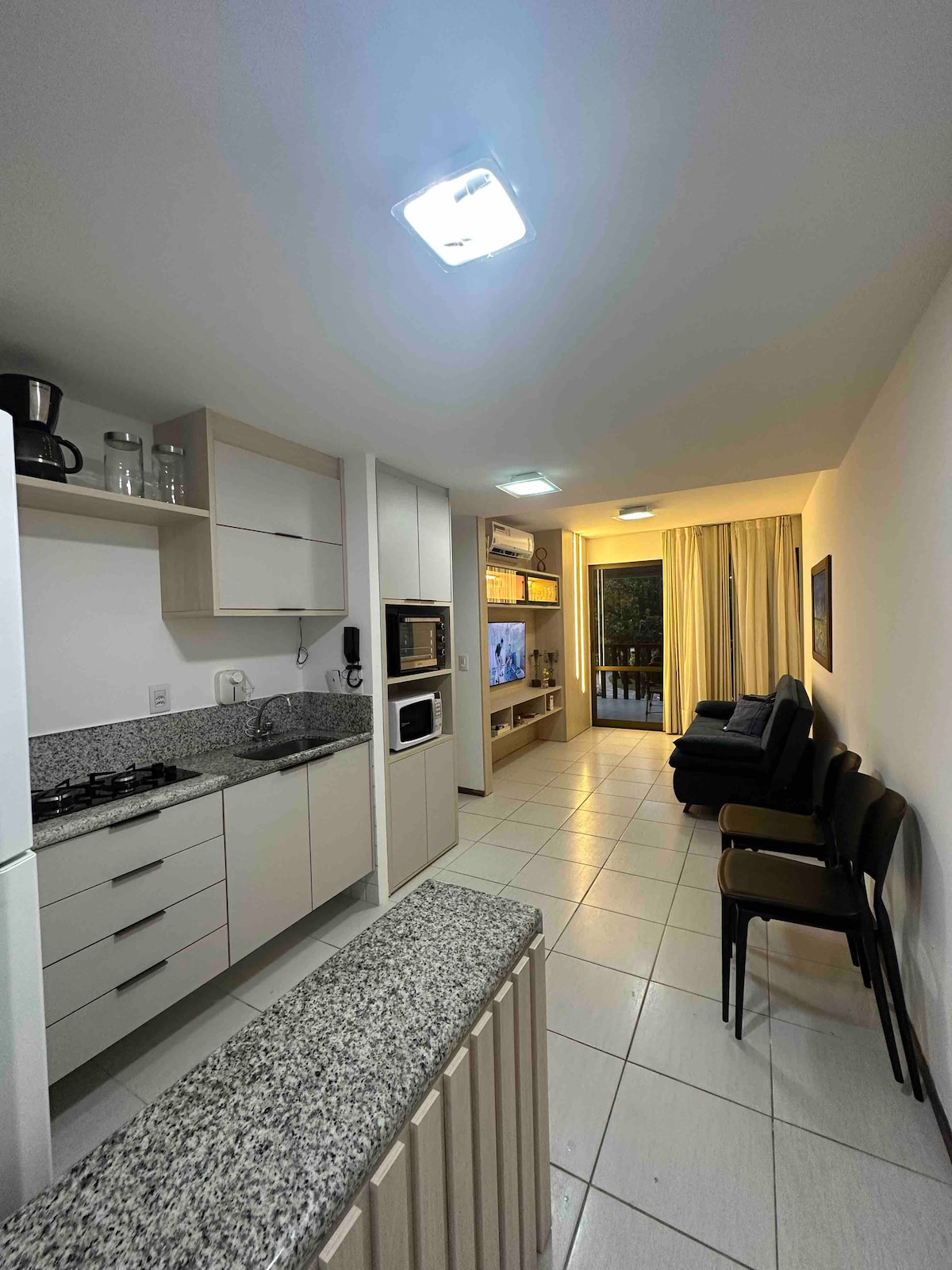 Dividimos em até 6x sem juros (pagamento pelo Airbnb) Térreo no Villa Del Porto com piscina privativa, decoração aconchegante e ambientes bem distribuídos para até 4 pessoas. Os cômodos são integrados e pensados para oferecer conforto e praticidade. Há um banheiro completo, uma área de home office, o espaço de dormir com cama de casal separado por parede retrátil, uma sala com sofá-cama e Smart TV, mesa de jantar e uma cozinha equipada. ideal para relaxar depois da praia.