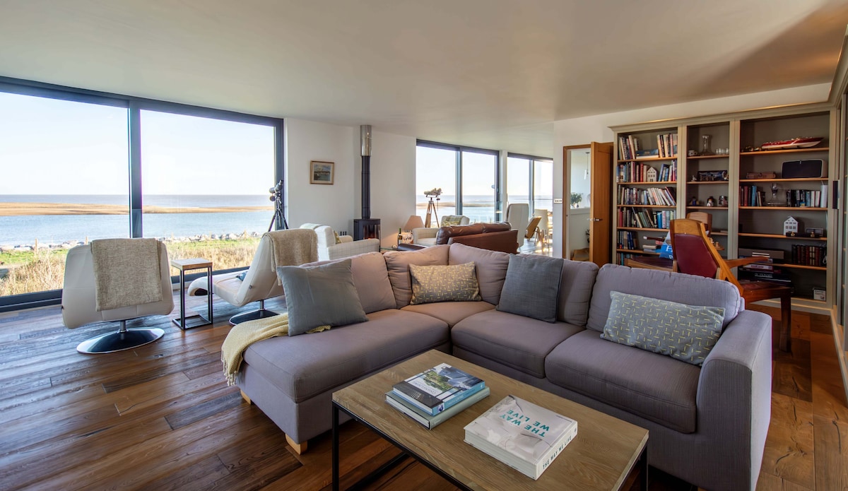 The Blackhouse Boatshed is a stylish new small house boasting stunning panoramic views over the boatbuilding and sailing hamlet of Pin Mill and the famous Butt and Oyster pub. Designed and built by local architects and craftspeople, the house is a perfect base for couples, close to the waterfront and in the heart of beautiful Suffolk countryside. There is a fantastic choice of walks, cycling, and horse rides, as well as opportunities to get onto or into the water or stay in and be cosy.