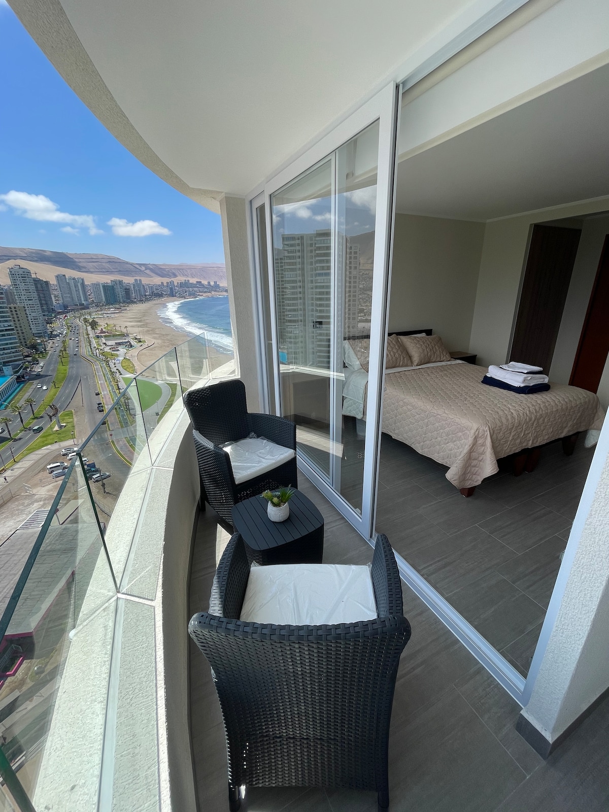 Precioso Departamento con una privilegiada Vista a la Bahia de Cavancha. En solo 5 minutos caminando puedes llegar a ella o tambien a Playa Brava por el lado Sur. Bajando del edificio encuentras los mejores Bares y Restaurantes de la Ciudad. Cercano al Supermercado Jumbo, Mall Plaza y Bancos. El departamento esta Full Equipado: -Cama Europea tamaño King -Tina Hidromasaje -Internet WiFi de Fibra Optica -Sofá Cama con Colchón -Terraza -Cocina Americana -Estacionamiento Privado techado