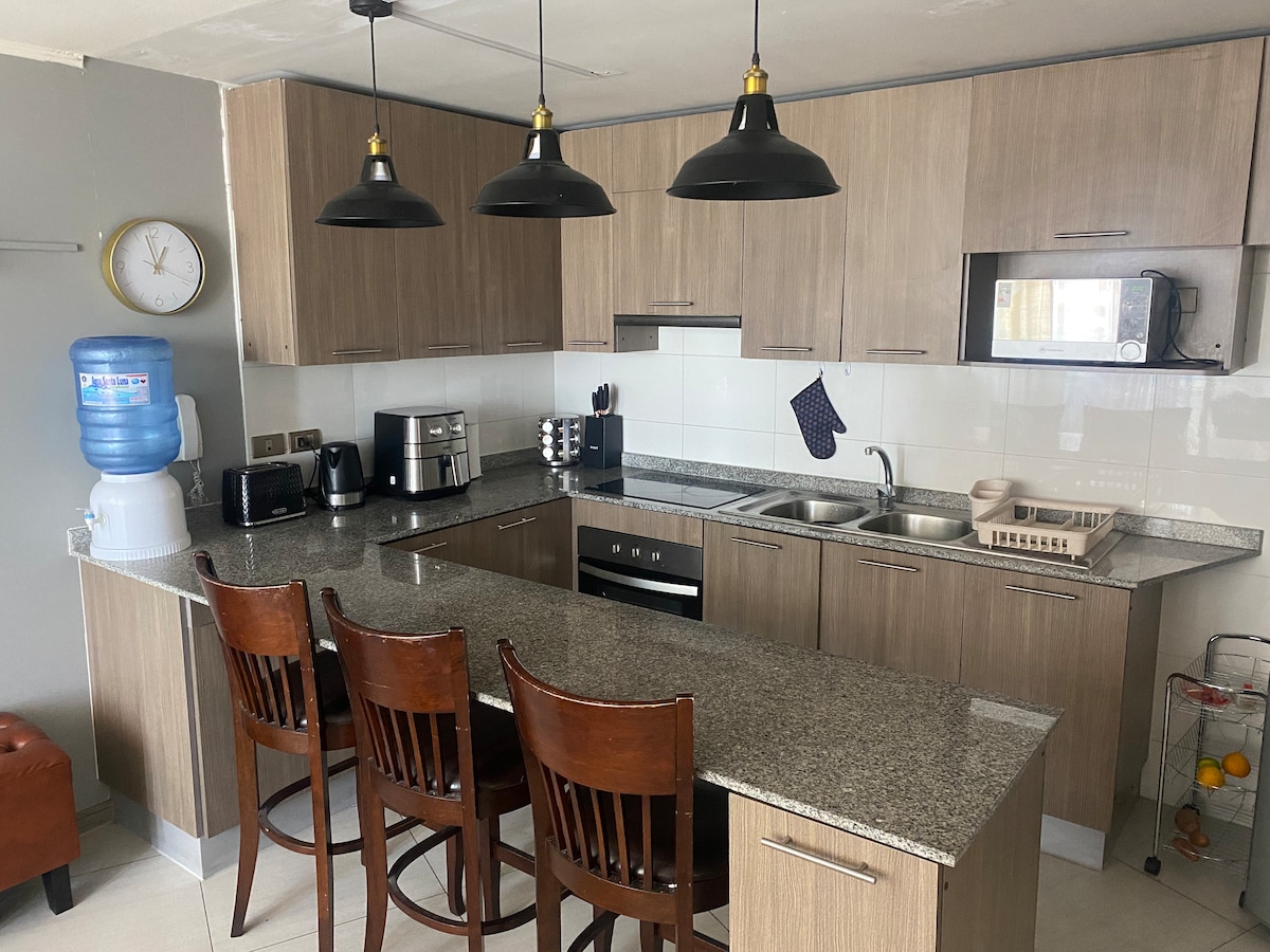 Disfruta de este alojamiento tranquilo y céntrico, equipado con todo lo necesario para una cómoda estadía. A dos cuadras de casco histórico de la ciudad, cercano de Paseo Boulevard Baquedano (tres minutos caminando), Plaza Prat, bancos, supermercados, restaurantes, bares, clínica, mercado y centro. A seis minutos de viaje en vehículo a Mall Zofri. A 10 minutos de caminata a Playa Bellavista. A 5 minutos en vehículo a Playa Cavancha y casino.