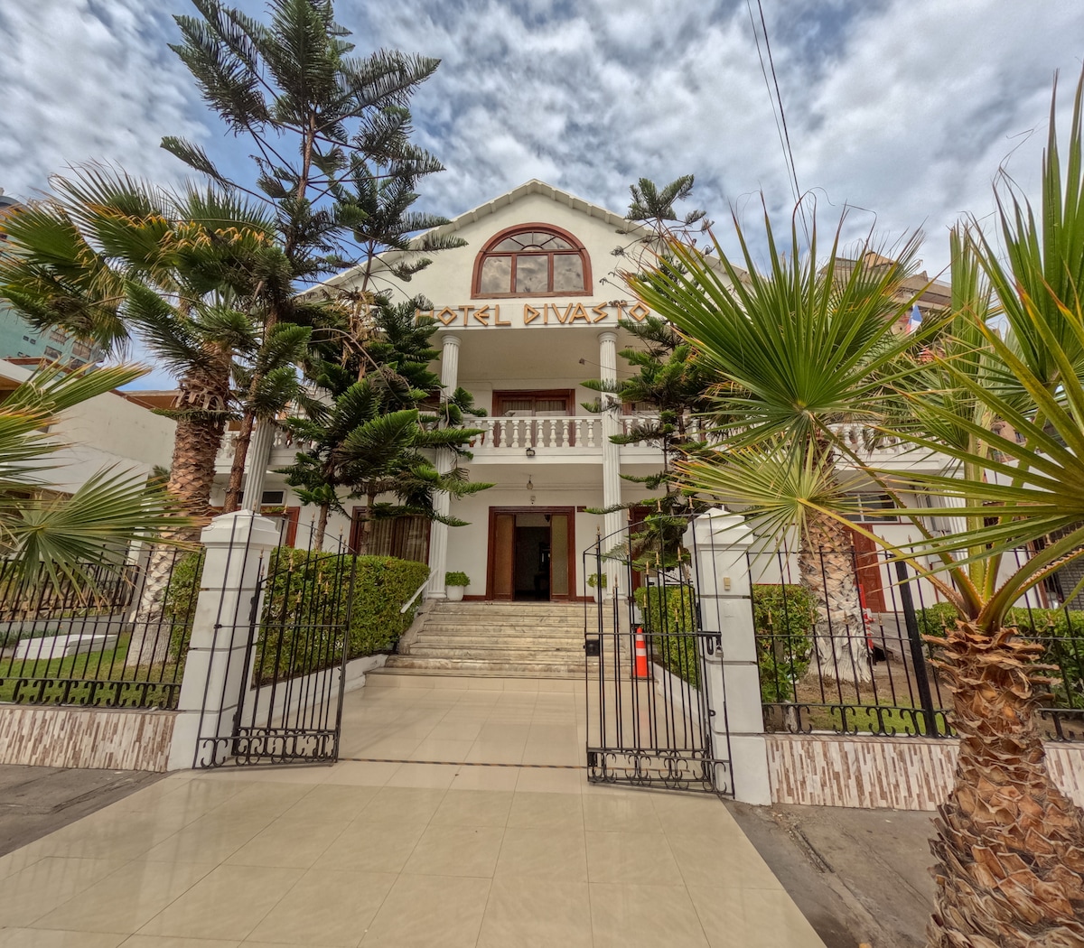 Hotel Divasto – Estilo clásico con toques modernos en el corazón de Iquique. Equilibrio perfecto entre elegancia y comodidad. Con arquitectura clásica, vitrales y detalles en madera, ofrece habitaciones privadas, modernas y confortables. Piscina rodeada de palmeras, ascensor panorámico, Wi-Fi, estacionamiento y atención 24/7. Ideal para familias, ejecutivos o parejas. A pasos del centro y la playa.