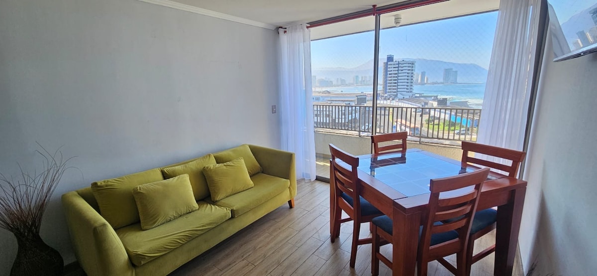 Departamento frente al mar, para 4 personas, con ubicación privilegiada, a 1 cuadra de paseo baquedano y a 1 cuadra del paseo playero (puedes ir caminando a los mejores lugares de Iquique) Cercano al comercio, clínicas, carabineros, pubs, gasolinera. El depto. Se encuentra frente al mar. Estacionamiento cubierto. Lavadora dentro del depto. El departamento cuenta con todas las comodidades para que pases increíbles días. Prohibido ruidos molestos, fiestas y fumar. Piscina no disponible para uso.