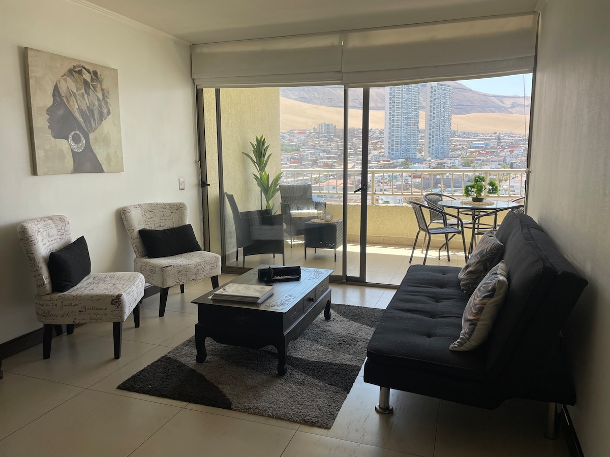 La vista del departamento es envidiable, las comodidades que ofrece el departamento son de alto nivel, está cerca de supermercados, casinos, Mall, patios de comidas, McDonalds, servicentros, restaurantes, pubs, a metros de la playa principal de Iquique Cavancha, etc..