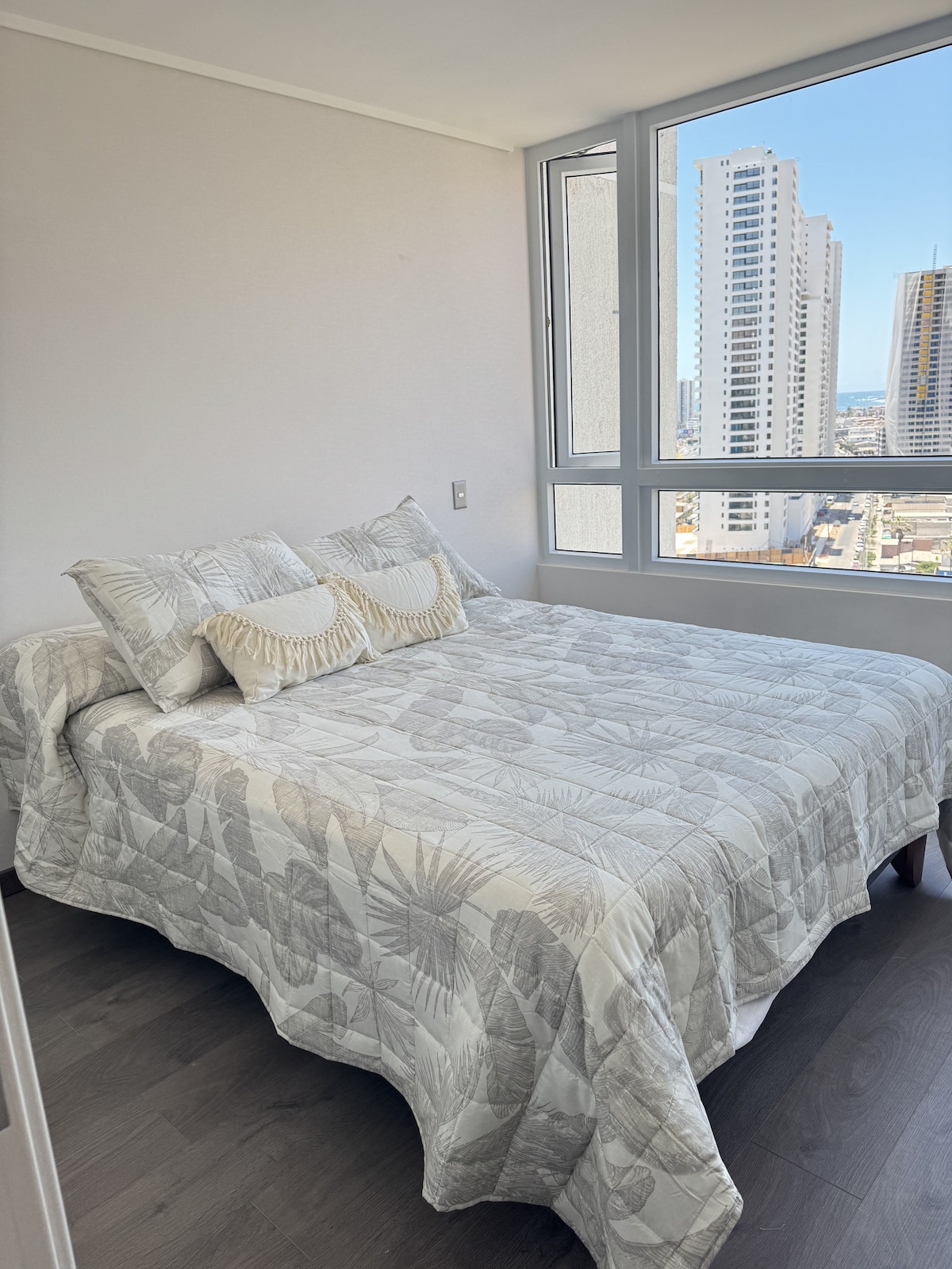 Disfruta de una increíble experiencia en nuestro departamento ubicado en el piso 23 en primera línea frente al mar, con vistas increíbles y cercano a puntos claves de la ciudad (Supermercados-centro comercial- bencineras-Restaurantes) El departamento se encuentra equipado y amoblado completamente para que tengas una experiencia más cómoda, para un máximo de 4 personas con cama matrimonial y sofá cama, una terraza que te permitirá disfrutar y compartir mientras ves un lindo atardecer.