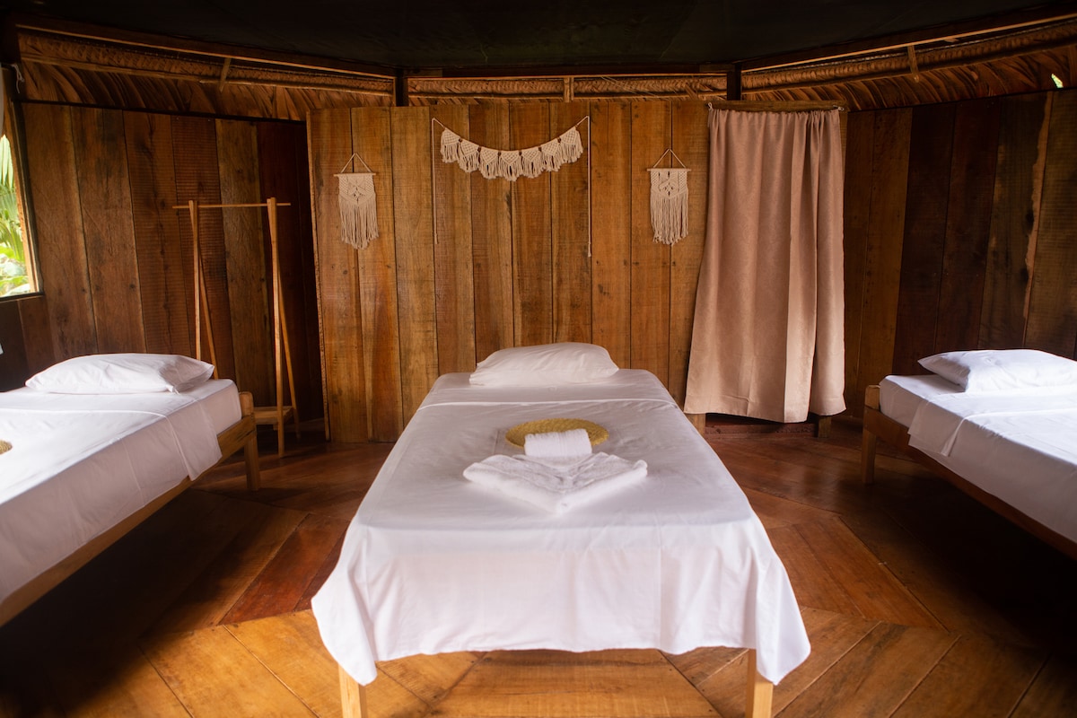 Habitación doble en lindo ecolodge a 10 min. del aeropuerto de Iquitos y 30 minutos el centro. De estilo rústico y natural, poseen balcón con hamaca y servicios higiénicos privados. En el ecolodge vivirá la cultura amazónica kukama, tendrá mucha paz y excelente vista panorámica de atardeceres dramáticos. . Electricidad 24 h, terraza con mecedoras, biblioteca, mesas para estudio y una escalera que te lleva a darte un chapuzón en el río. Incluye desayuno.