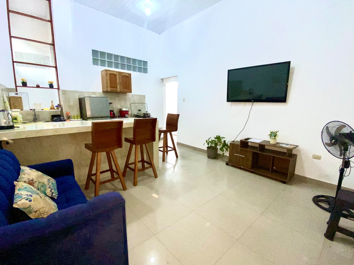 Apartamento de estreno, tranquilo y espacioso con wifi de fibra óptica (alta velocidad). Gran jardín exterior con áreas comunes para trabajar o descansar. Habitación con cama de 2 plazas y sofá cama. Posible agregar una cama de plaza y media. Mueble para trabajar y closet espacioso. Baño privado con excelente presión de agua, cocina amplia equipada con frigobar, cubiertos, platos y ollas. Mesa de comedor. A 10 min del centro de la ciudad y aeropuerto en transporte público (motocarro o taxi).