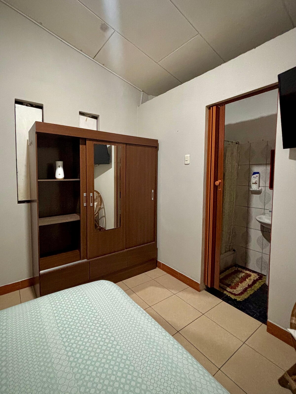 Habitación con aire acondicionado, cómoda, confortable, limpia, tranquila y segura. Tiene guarda ropa, plancha eléctrica, mesa de noche con lámpara, toma de corriente cerca a la cama para carga de celular, cama confortable de plaza y media, Tv. cable, Wi Fi, mesa de trabajo y sillón de estar. Solo para Huéspedes cocina comedor, refrigerador, lavadora. Ideal para persona que viaja por negocio o turismo. Se brinda sabanas, toallas, servicio de limpieza de habitación, SS.HH. privado.