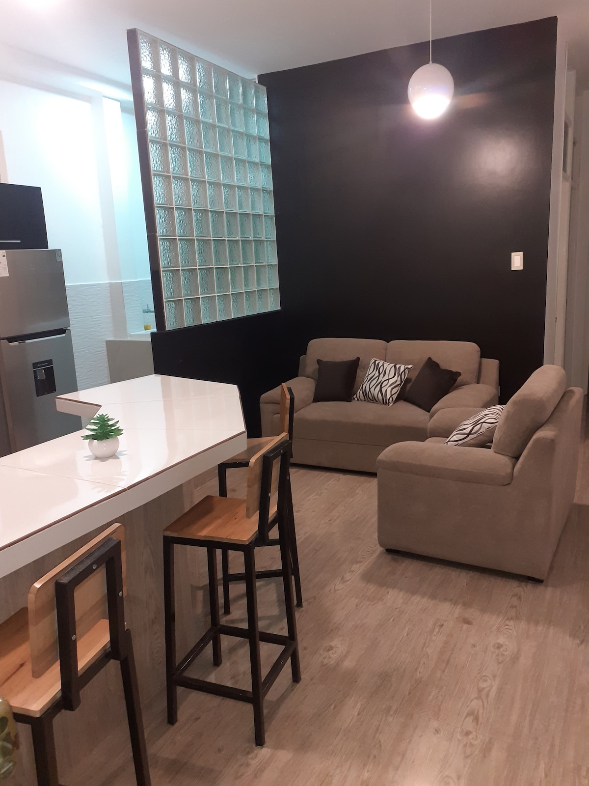 El apartamento cuenta con dos espacios que se distribuye de la siguiente manera. 1. Dormitorio: Con una cama de dos plazas , una cama de plaza y media y una litera , aire acondicionado, baño privado con agua caliente, Smart tv, mesa escritorio y armario. 2.Sala comedor: Ventilador,Microondas, licuadora, tetera, olla arrocera, cocina a gas, refrigerador, vasos, platos, utensilios de cocina, olla y sartén.