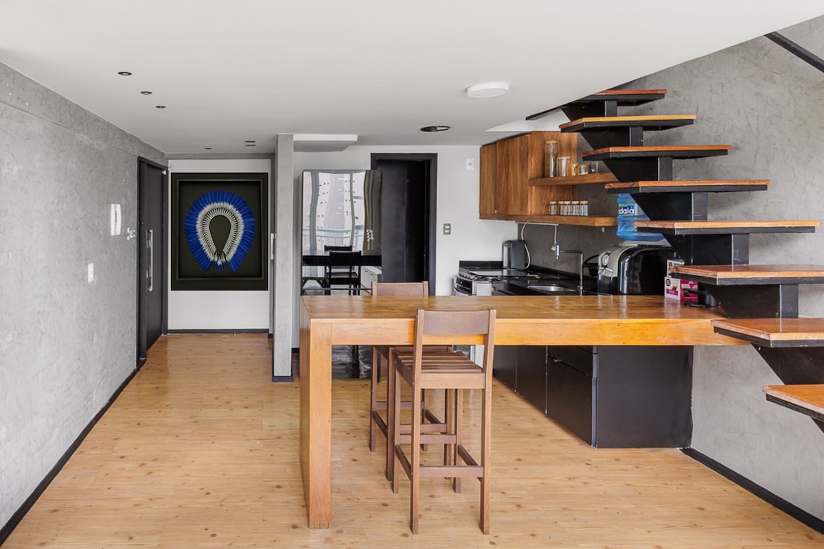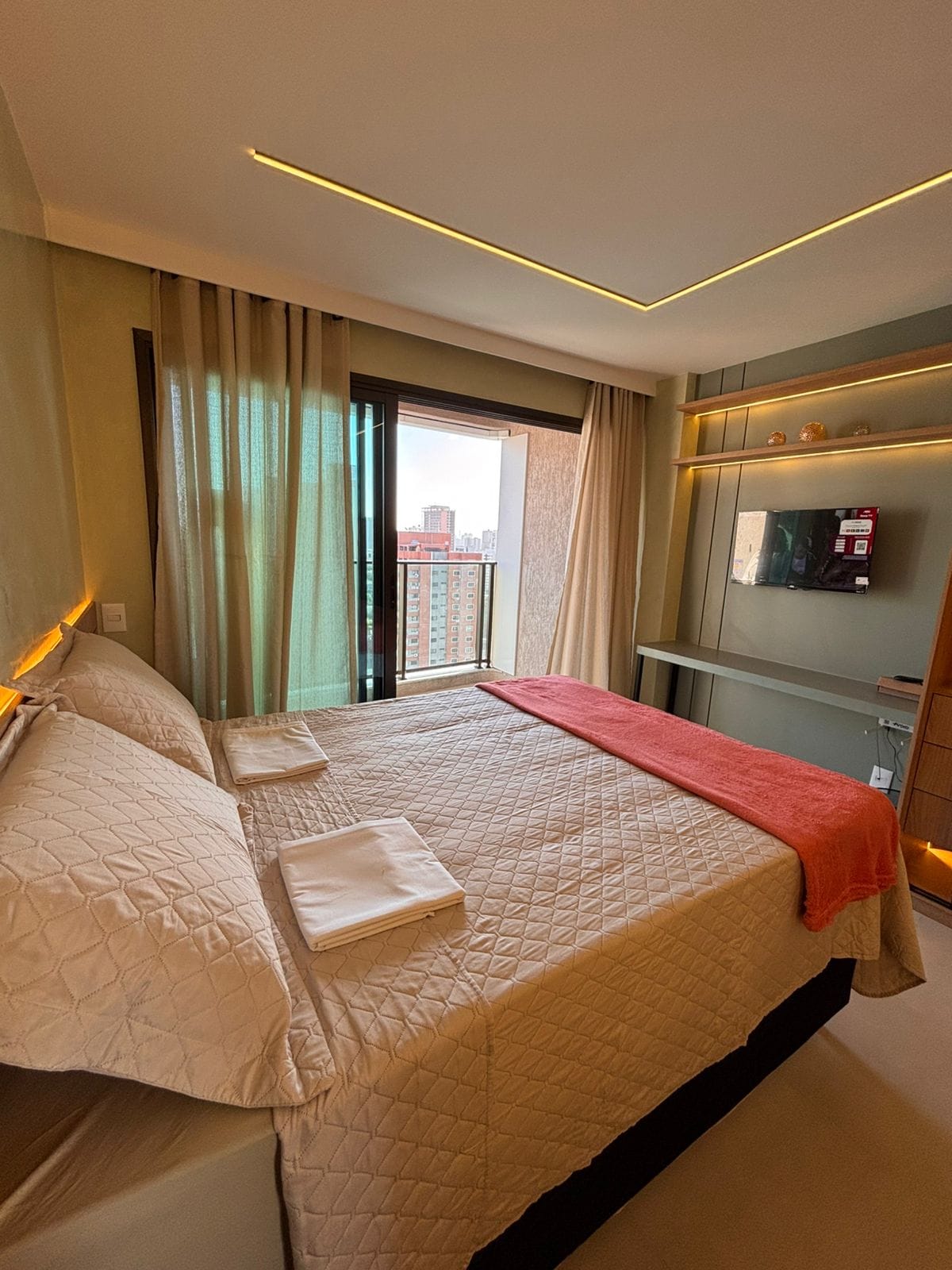 STUDIO COM UM ROOFTOP ESPETACULAR Planejado para oferecer uma estadia prática e aconchegante para clientes exigentes. -Cama de casal QUEEN Premium e enxoval. -TV 58” e canais a cabo com Filmes e Premiere para não perder os Jogos de seu time. -Cozinha com Cafeteira a cápsula Fogão,Microondas,Geladeira Duplex,Sanduicheira,Liquidificador,Purificador de Água Gelada, Ayrfrier; -Banheiro Moderno com Ducha de Água Quente revigorante, Secador de Cabelo. -Varanda com Mesa e cadeiras confortáveis.