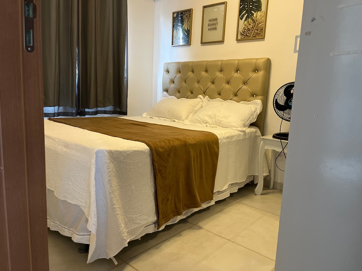 Apartamento térreo, (possui grades nas janelas) condomínio fechado com serviço de portaria, ambiente familiar. Dispõe de 02 quartos - 1° quarto :ar condicionado, escrivaninha, 01 CAMA CASAL - 01 colchão solteiro. 2° quarto: ventilador, 01 CAMA CASAL, closet. 01 sala - sofá , mesa de jantar, TV. 01 cozinha com armários, fogão, micro-ondas , 01 frigobar, máquina de lavar. 01 banheiro com água quente. Possui pistas para caminhadas, quadra de areia, piscinas.