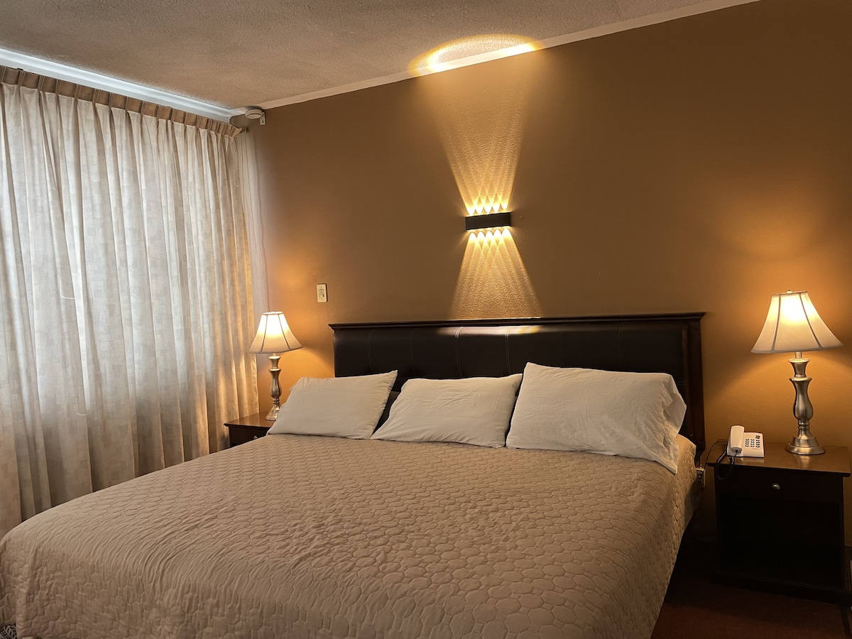 Contamos con 7 habitaciones privadas con capacidad de hasta 3 personas, cada una con baño y televisión con cable. Estamos ubicados en una zona centrica de Irapuato, nos encontramos muy cerca del Estadio SLC, al igual que del centro de la ciudad y de varios establecimientos como MacDonalds o Corpovino. La habitación Intercontinental de Marev cuenta con un cuarto de 30 m2 aprox. y una cama tamaño king.