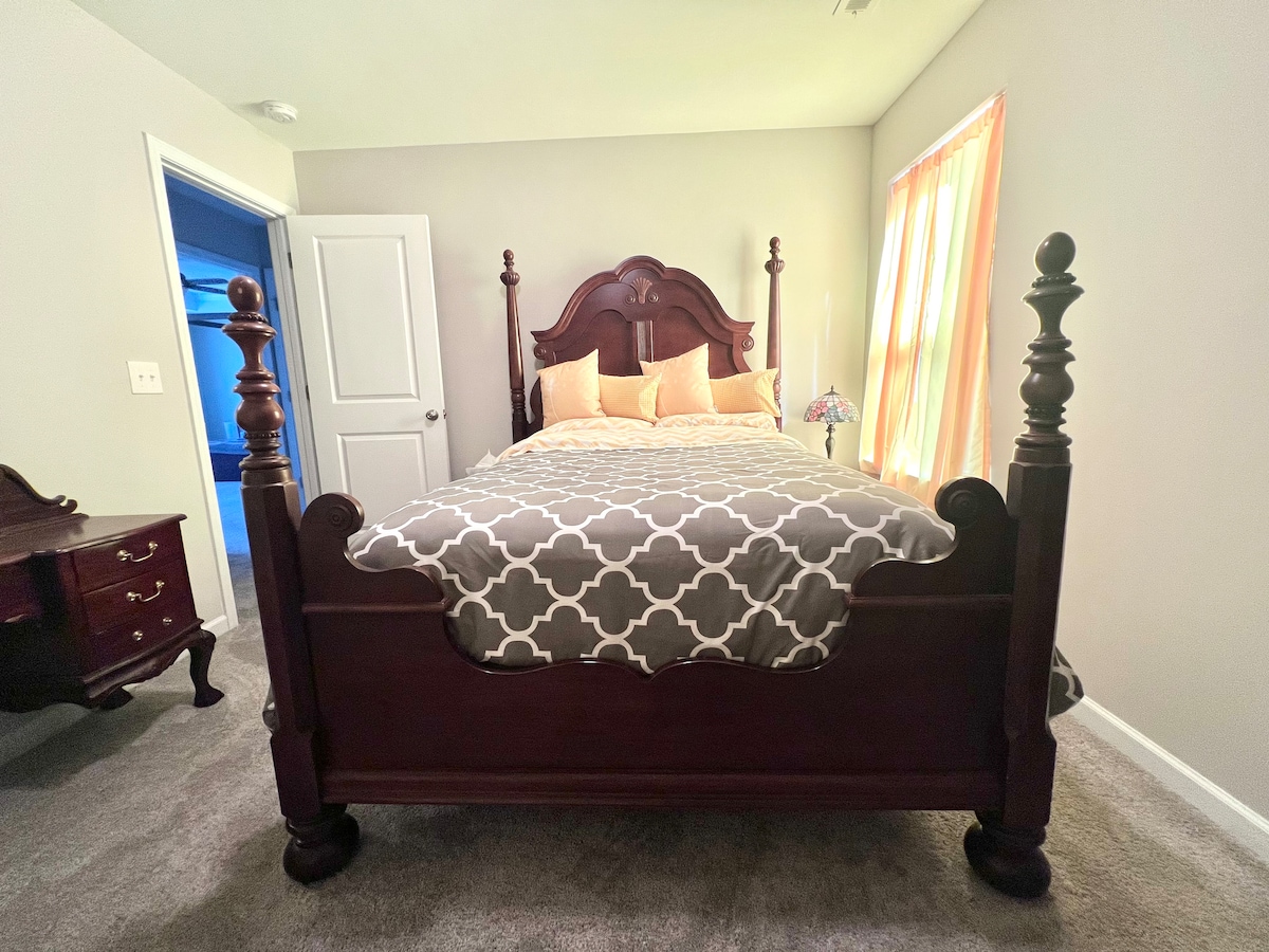 Room 3, “Serene Slumber Suite” Queen size wooden canopy bed with a 12” memory foam cooling mattress, sitting area and a ceiling fan. Your private attached bath includes 2 sinks and a large tiled shower. Walk-in closet and 55” Roku TV. You have access to Netflix, Paramount, AppleTV. High speed fiber optic wifi is also available for all of your work or gaming needs. Your space is not shared with any other guests. Smoke, toke and vape outside. You may use the front porch or Gazebo out back