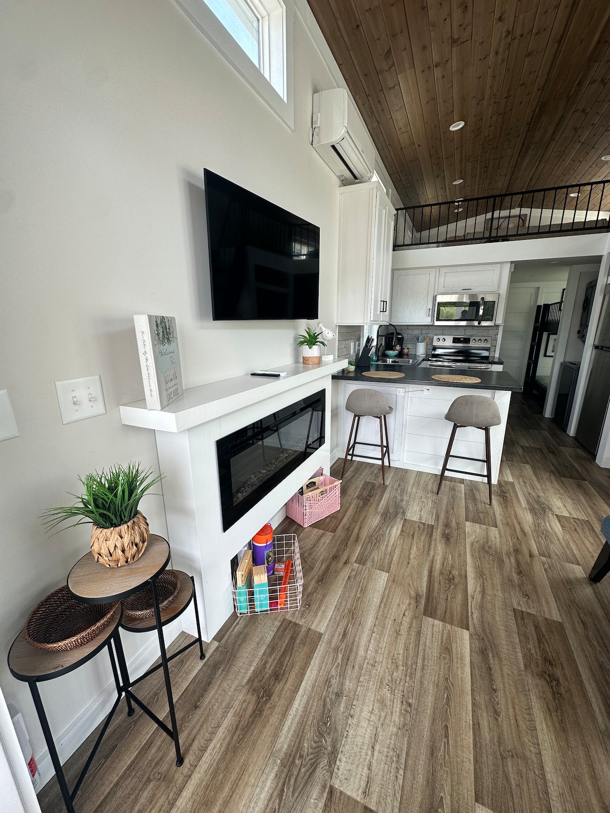 Escape to the charm of tiny living with big-time relaxation at our cozy and stylish tiny home in the heart of Lake Norman RV Resort. Perfectly nestled just steps from the water, this beautifully designed retreat offers all the essentials for a peaceful lakeside escape including a front porch with rocking chairs and 2 private decks! Sleep 6 comfortably with the king size master bedroom, twin and full bed in the loft and a queen pullout sofa bed. Includes fully equipped kitchen and full bathroom!