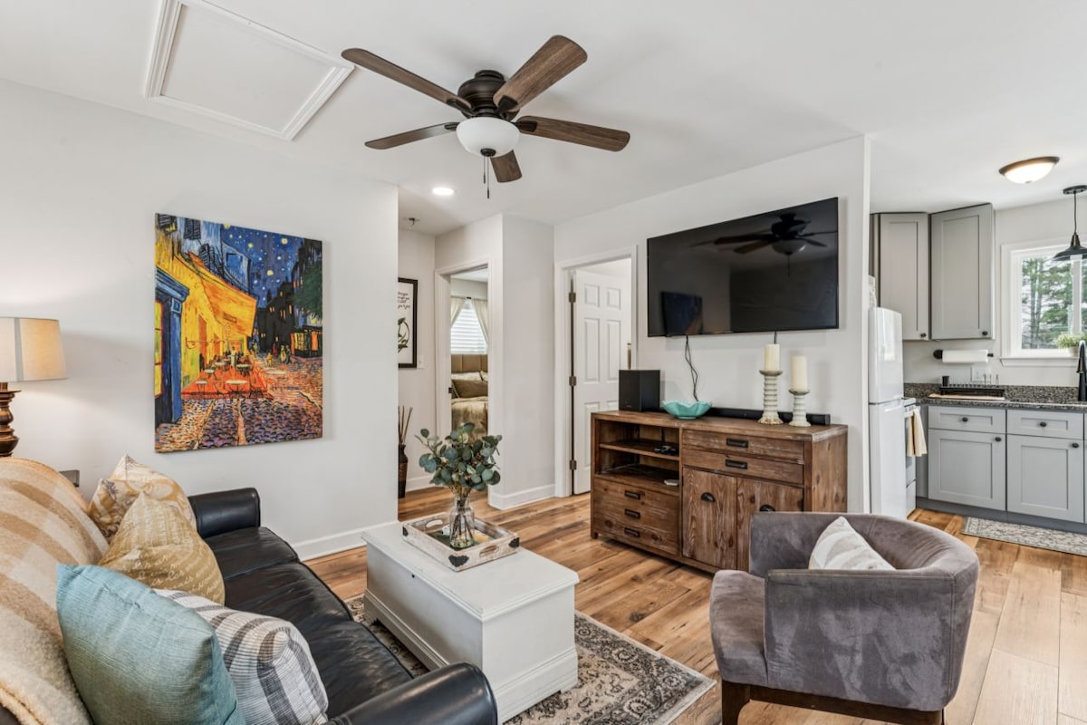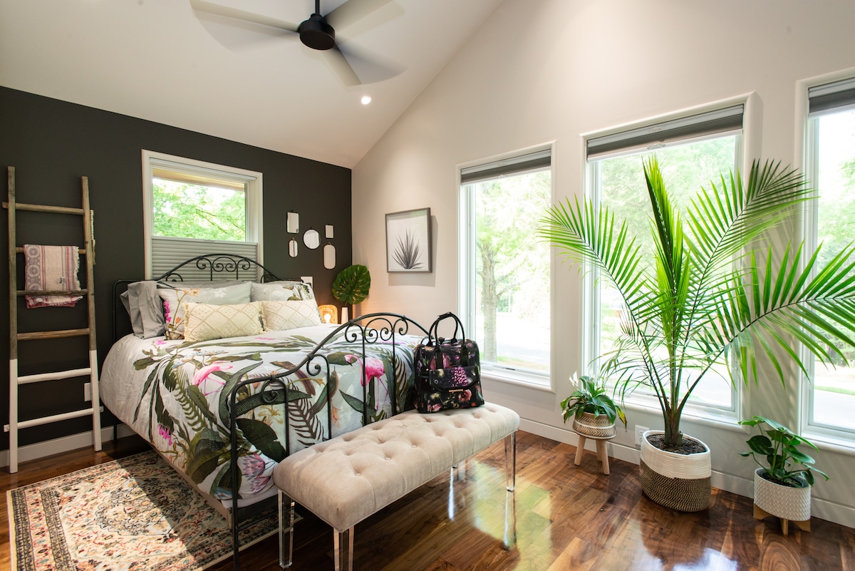 LAKE FRONT, custom built in 2018. Nestled amidst the trees, you will enjoy our private guest house. Included: 1 bedroom with queen bed, full bath with shower, elegant great room with fully equipped kitchen. Also includes a large open air porch with vaulted ceiling and sky lights. Enjoy fishing, swimming, kayaking, and pedal boating from the owner's dock. Restaurants & activities minutes away. EV charging available on premise. The guest house is a separate structure with it's own hvac.
