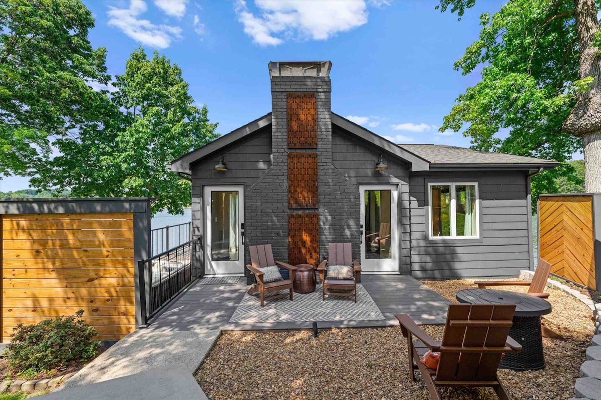 Escape to The Boathouse, a fully renovated suite surrounded by beautiful lake views and a peaceful atmosphere. Enjoy a new kitchen with modern appliances, a luxurious spa bathroom, and a spacious bedroom with a king-size bed. The open living area features a dining table for four, a cozy living room with a fireplace, and a 60" smart TV. Step outside to an expansive deck with a hot tub and grill. Perfect for romantic getaways or fun-filled family vacations.