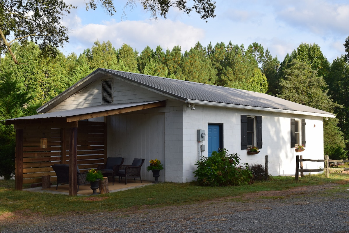 Relax with the whole family at this peaceful setting. Close to interstate 77 and 40, this rural farm is rustic elegance. With a library for the family and a home theater with classic DVD's, you have plenty to do even on rainy days. The bedroom has a king bed, and the main room has a trundle with two twins and a futon sofa. The 900 sq. ft. guesthouse you'll stay in, was the old welding shop from years ago and gives you access to walking trails and the farm burn pit.